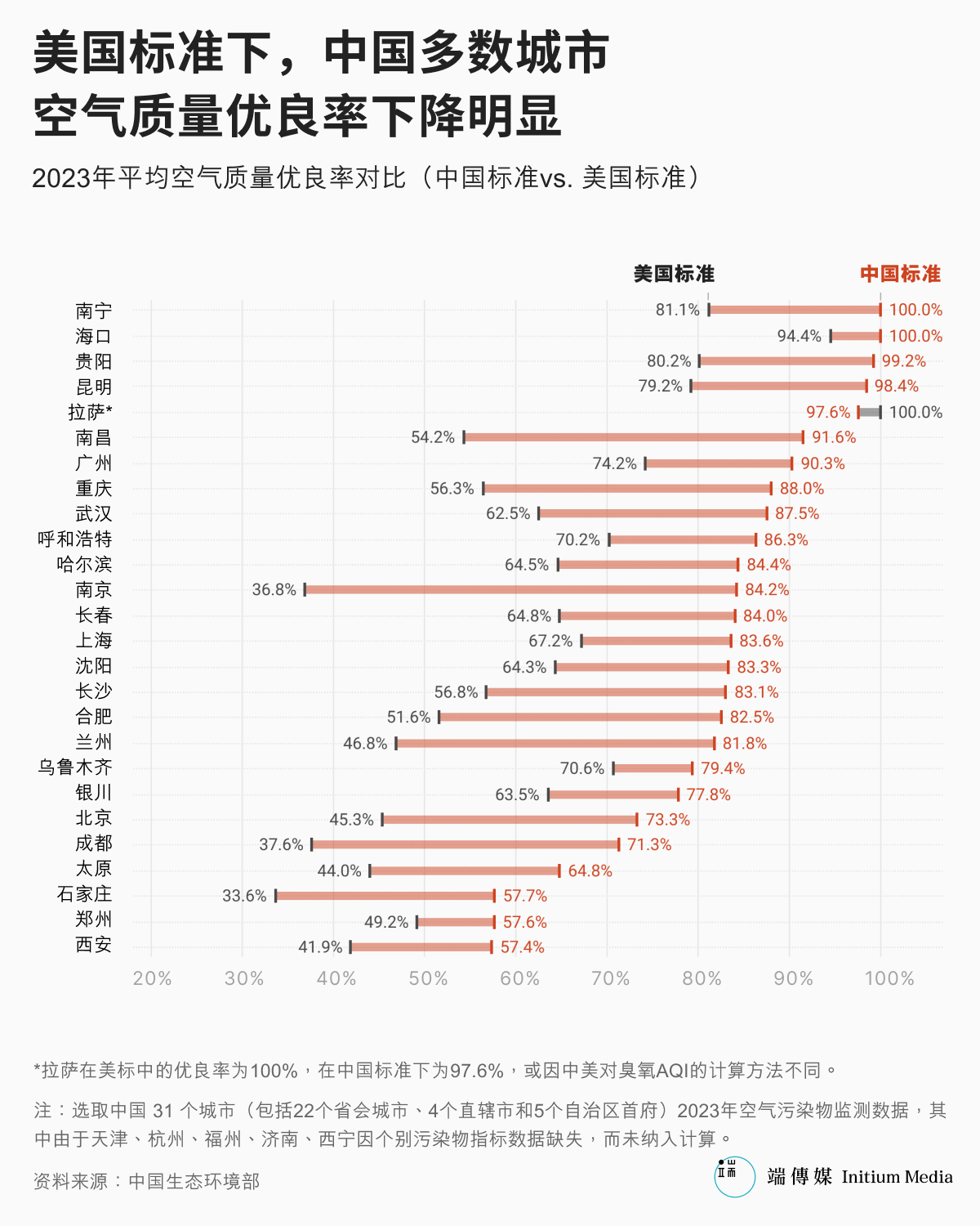 在中国现行标准下,2023 年 31个 城市中有九个城市达标,全年优良天数超过一半;而在美国标准下,仅有拉萨和海口两个城市达标,有八个城市的优良率不到50%。