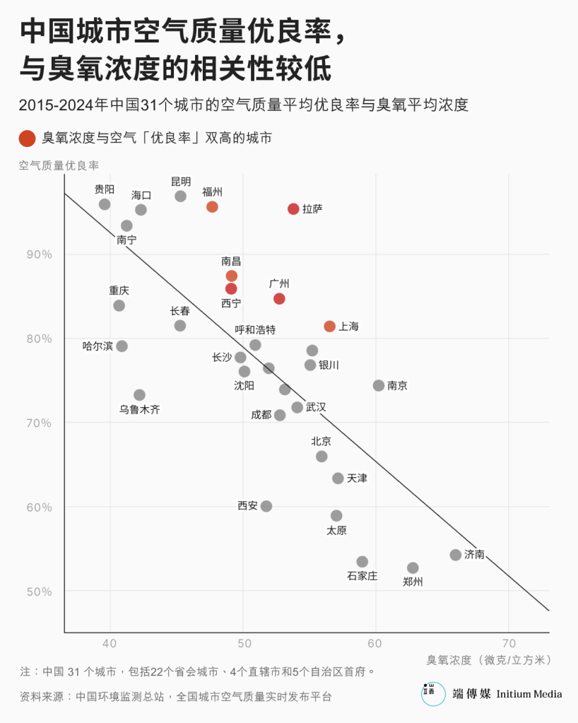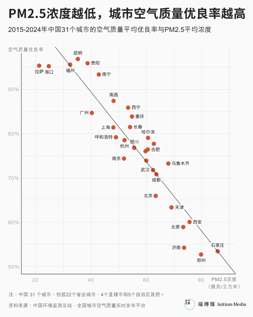 也因为中国大气污染的特征, PM2.5 会较其它污染物更大程度决定一座城市空气质量的优良率。端传媒分析数据发现,中国 31 个城市的 PM2.5 平均浓度,与空气优良率之间存在明显的负相关关系。