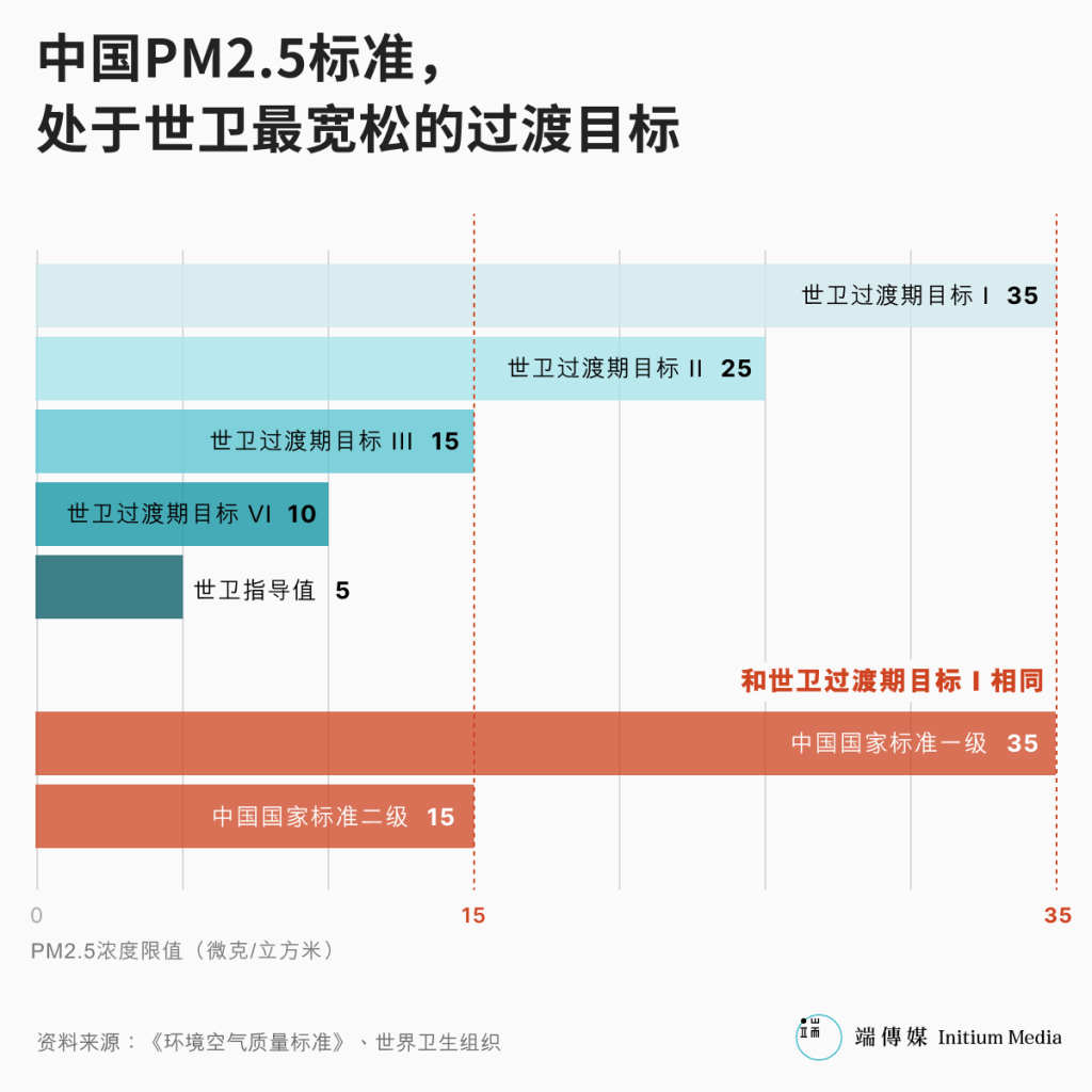 而中国实行的“35 微克/立方米”——仅对应世界卫生组织要求的“过渡期第 1 级目标”。这指标是世界卫生组织为污染较严重的地区制定的一个最初级的建议值,后面还有第 2 至第 4 级目标,直至降至较有利健康的指导值。