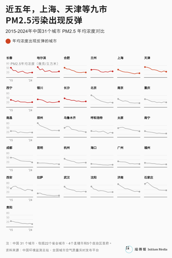 中国标准不仅跟不上国际研究的变化,更掩盖了空气治理的停滞。连续多年“达标”后,上海、天津、长春等九座城市 PM2.5 污染出现反弹。