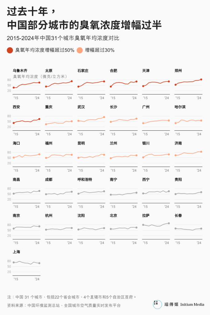 数据显示,在大多数污染物年均浓度呈下降趋势的同期,多数城市的臭氧浓度不降反升。其中,太原、郑州、石家庄、武汉、天津等地的臭氧年均浓度,在过去十年中升幅超过一半。