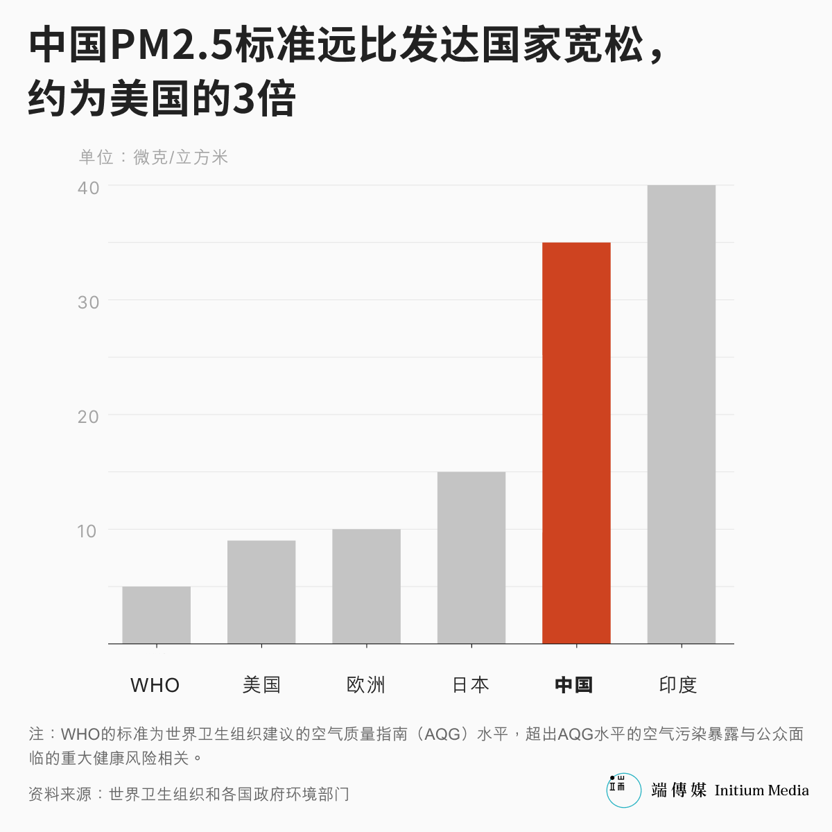 中国标准中 PM2.5 的年均浓度限值为 35 微克/立方米,远高于世界卫生组织建议的 5 微克/立方米,也高于美国(9 微克/立方米)、欧盟(10 微克/立方米)及日本(15 微克/立方米)等发达国家的标准,在国际上仅优于印度和埃及。
