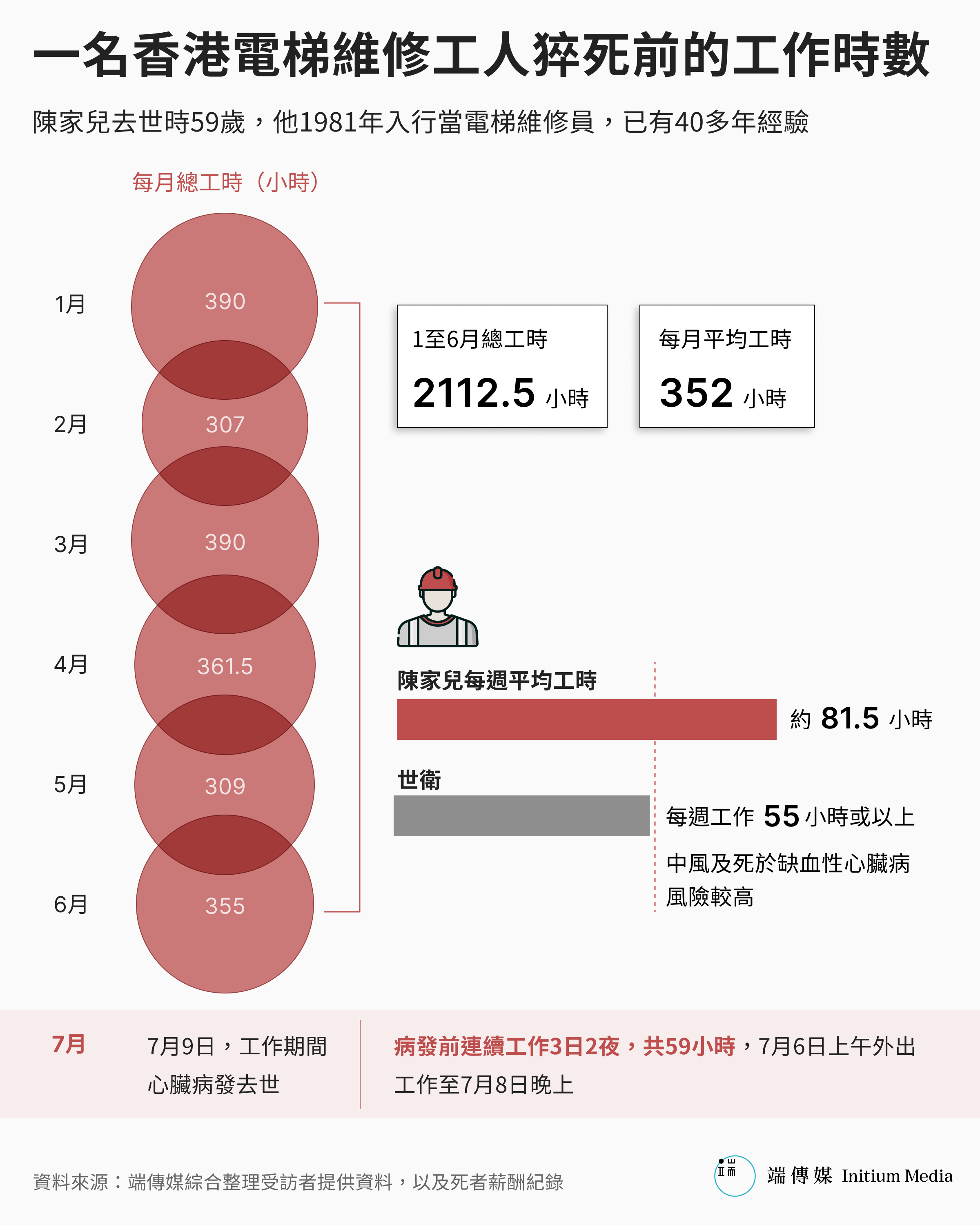 陳家兒去世前半年,每個月平均工時超過350小時。筆者訪問了3位來自不同公司的電梯維修員,發現他們每月工時都超過300小時,有的更長達每月400多小時。