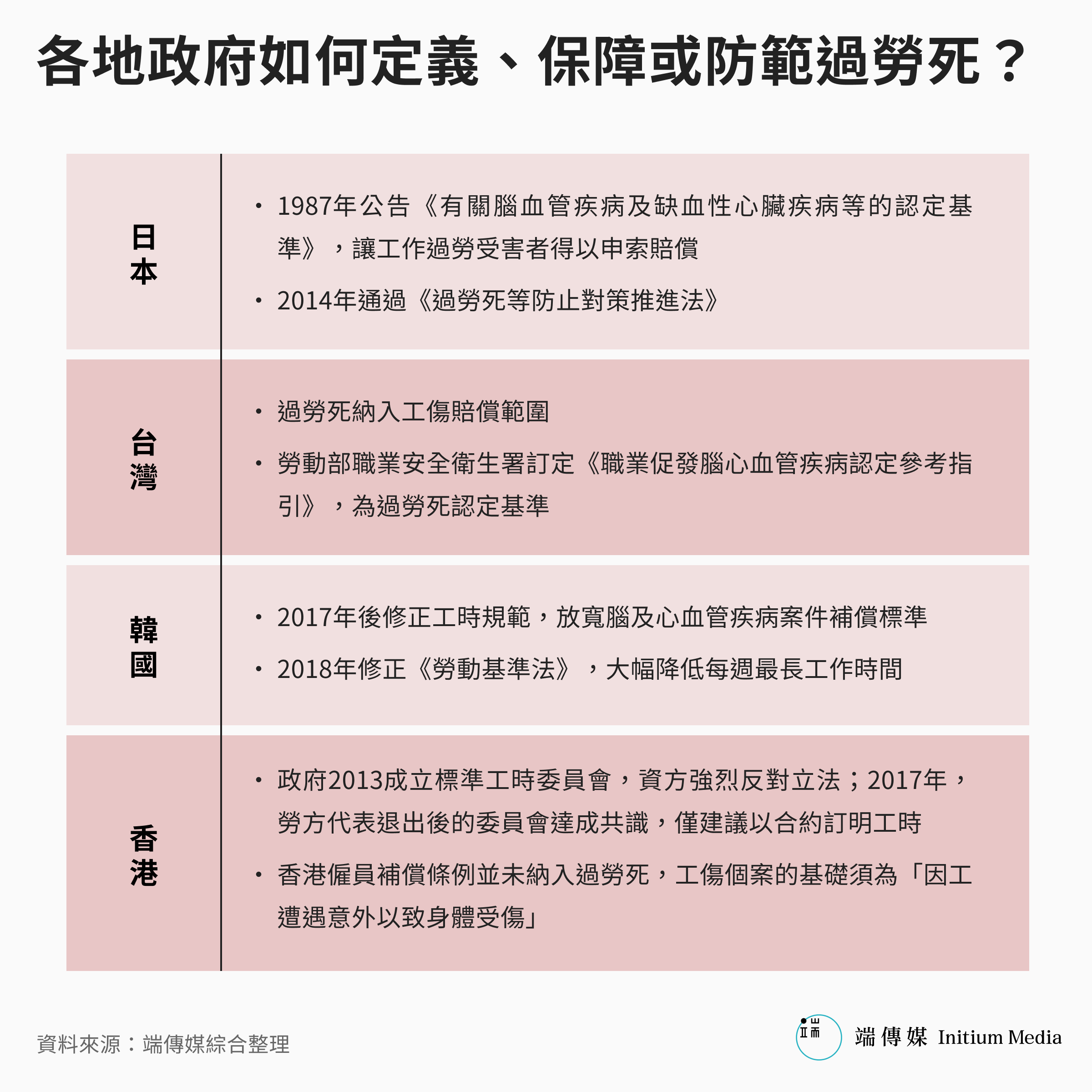環顧四周,台灣、日本、韓國都有法例保障,若確認工人因為工作過勞而引致自身疾病病發,可獲賠償。中國大陸的工傷保險條例亦有規定,在工作時間和工作崗位,突發疾病死亡或在48小時之內經搶救無效死亡的,將視同工傷。而香港《僱員補償條例》並沒有過勞死的部分,工傷個案的基礎須為「因工遭遇意外以致身體受傷」,而自身疾病病發是否屬於意外、與工作是否有關,須由家屬舉證證明,過往的法庭案例亦時有爭議,敗訴居多。