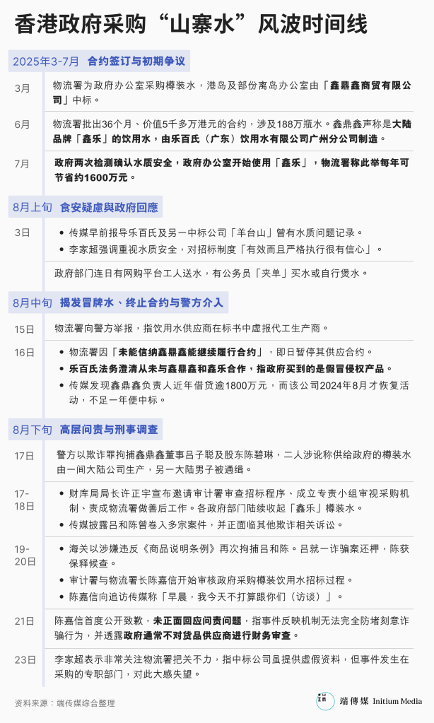 另外香港01亦引述消息,指政府转用大陆品牌饮用水后“收到太多投诉”,物流署向中标品牌的总公司查询,发现该公司没有通过或授权香港公司投标,而香港中标公司无人应门,怀疑人去楼空。