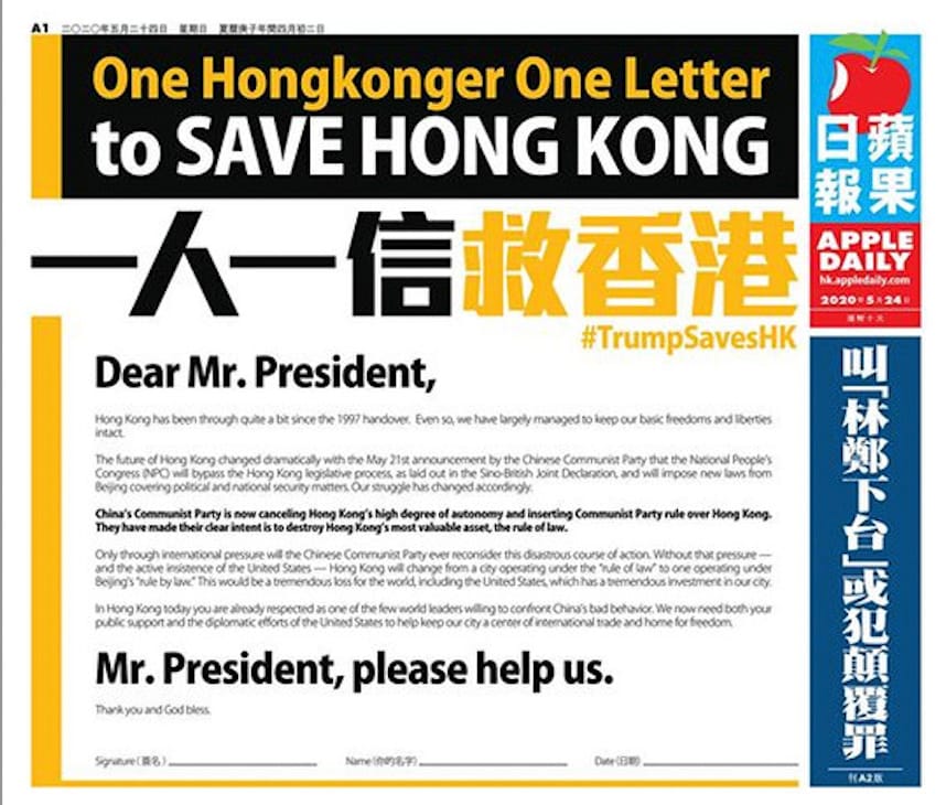 控方指控黎智英「請求制裁」的案例,包括在《國安法》生效前一個月——2020年5月——《蘋果日報》推出「一人一信救香港」行動,雖然沒有明確要求制裁,但屬公開要求美國干預香港事務;在《國安法》生效後,黎繼續在公開言論中對中國及共產黨作出「虛假描繪」,提出「香港已完蛋」,並鼓勵美國撤銷香港特殊地位。控方認為,這些言論即使不是公開呼籲,也已構成勾結罪內「請求」制裁、封鎖。