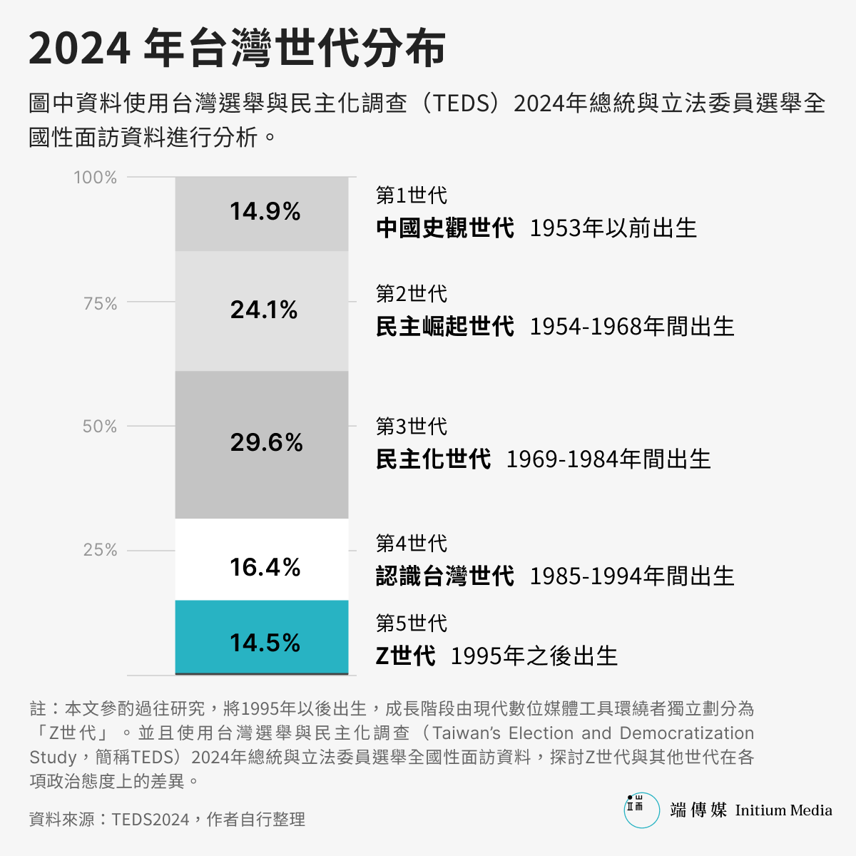 在人口特徵分布上,TEDS2024的Z世代男性比例明顯偏高,達60.6%,與第4世代(57.1%)相仿,較全體男性比例49.1%高出11.5%。然而根據內政部所公布2024年人口資料,Z世代的男性比例應為51.9%。也就是說,TEDS2024資料在Z世代有男性比例偏高的情形,需要注意。