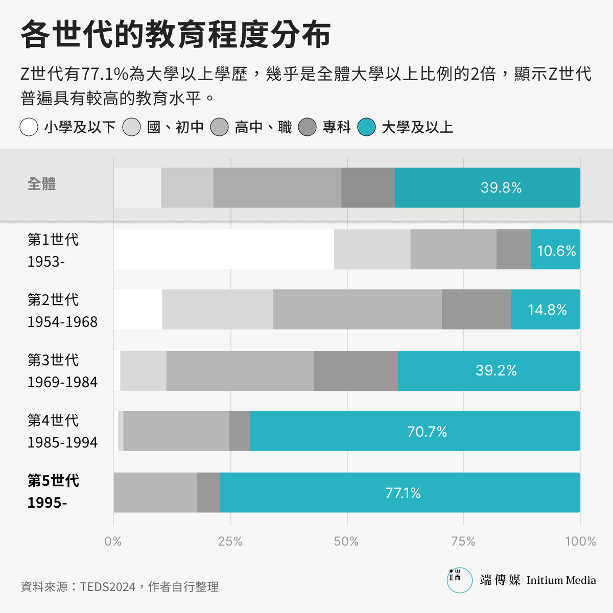 在教育程度方面,Z世代有77.1%為大學以上學歷,幾乎是全體大學以上比例39.8%的2倍,顯示Z世代普遍具有較高的教育水平。而這個現象與第4世代亦相仿,第4世代大學以上學歷者也已經超過70%。