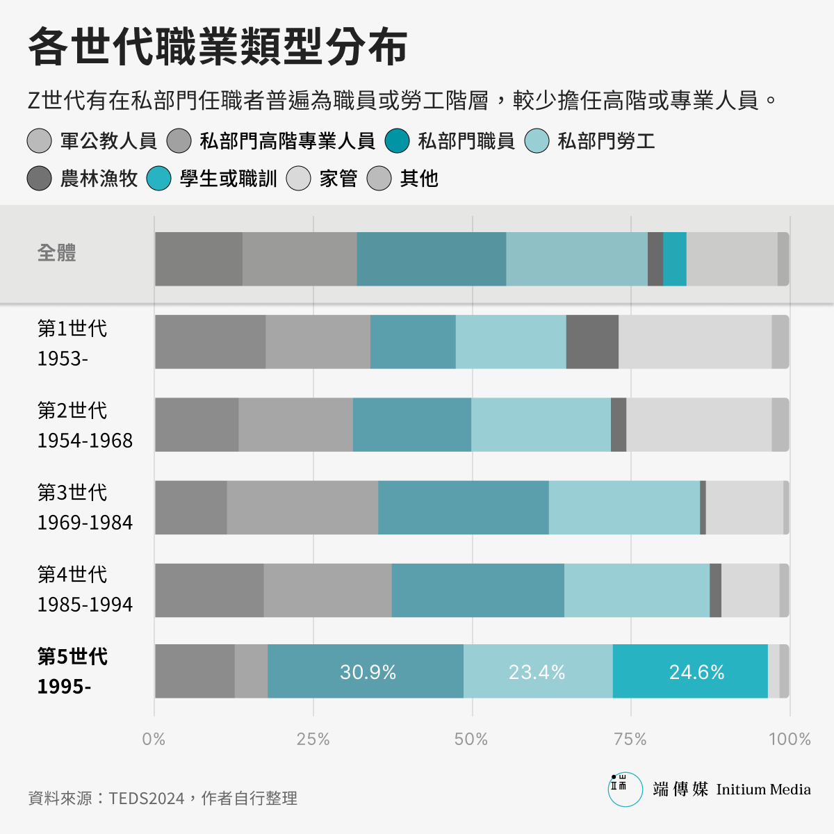 在粗略的職業類型方面,Z世代有在私部門任職者普遍為職員(30.9%)或勞工(23.4%)階層,較少擔任高階或專業人員。此外,Z世代仍有24.6%為學生或參加職業訓練中。