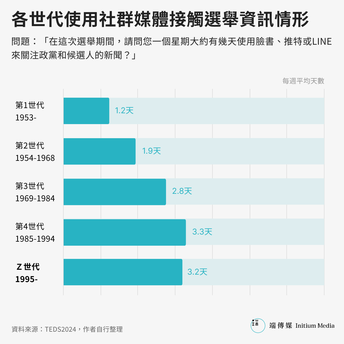 綜合而言,Z世代普遍具備高教育程度,在職場中擔任中階或基層人員,或是仍在求學。那麼,他們在政治議題的接觸上,真的有所不同嗎?TEDS2024有一題問: