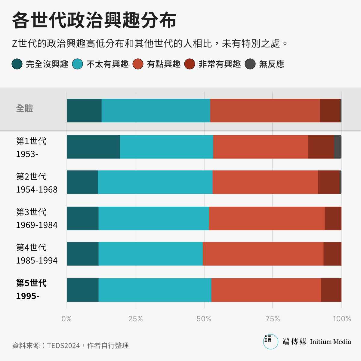 換言之,我們無法宣稱Z世代的人對於政治議題偏冷漠,因為他們的政治興趣高低分布,和其他世代的人相比,並未有特別之處。