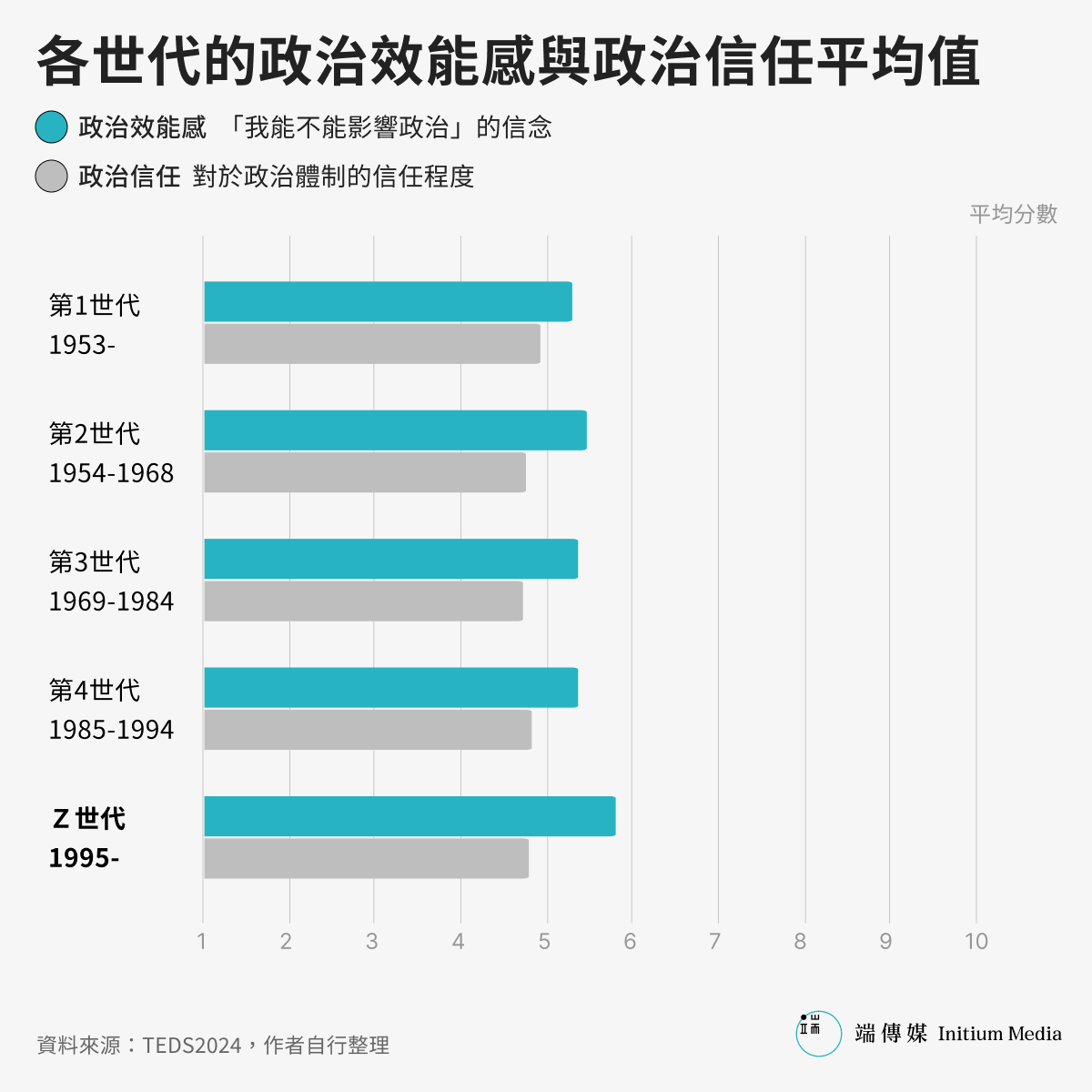 本文發現,Z世代並非政治冷漠的一群人,而是和其他世代一樣,對政治感興趣與不感興趣的人,其比例分布並沒有特別之處。此外,他們的政治效能感和政治信任平均而言,也和其他世代沒有顯著差別。唯一特別之處在於,Z世代政治效能感較低者,其政治信任還是比其他世代高一些。也就是說,Z世代即便有部分人對於政治有種無法影響的「無力感」,但願意相信相信政治體制的人還是比其他世代來得多。