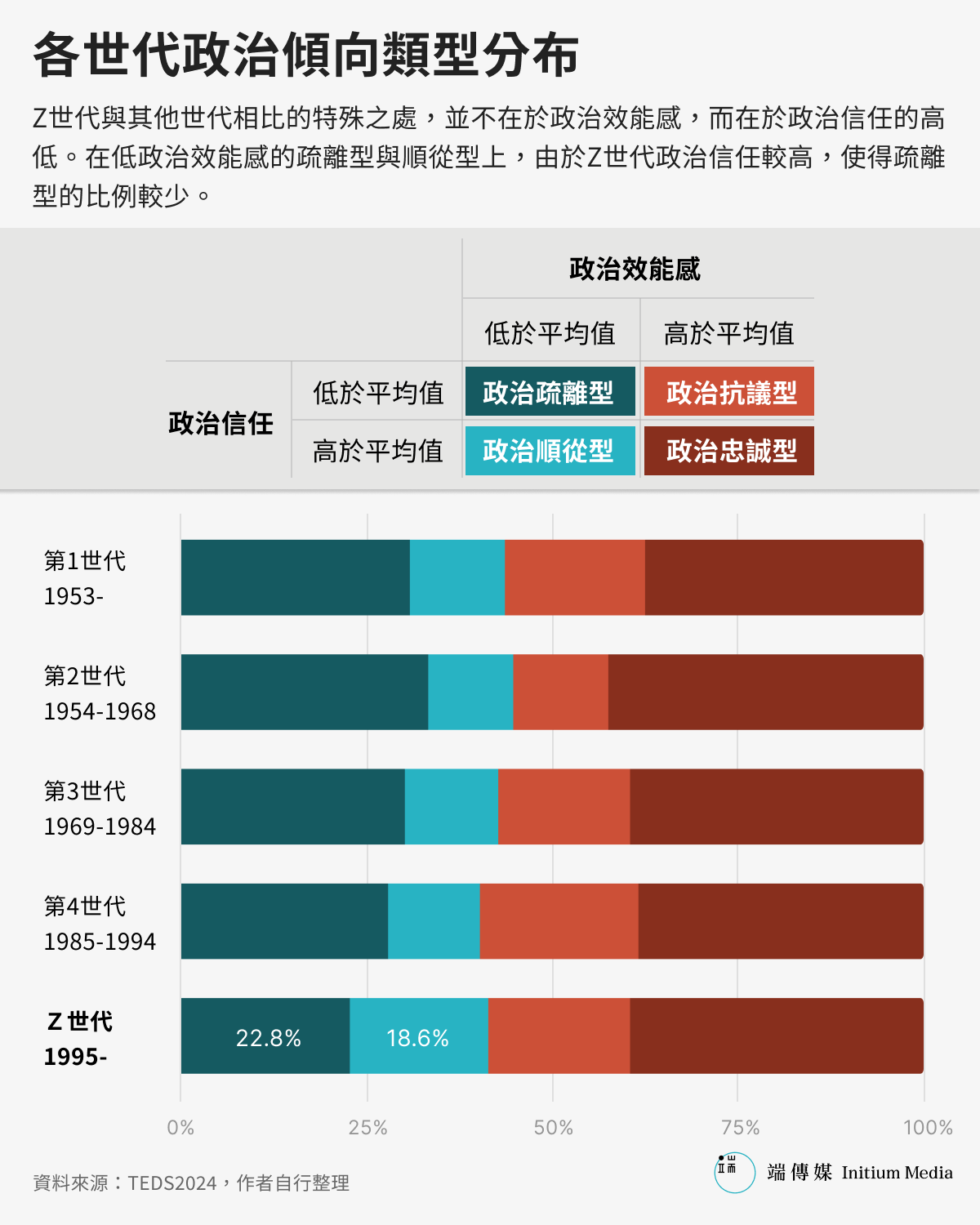 然而,Z世代的疏離型比例(22.8%)比其他世代更低,這代表Z世代「低效能-低信任」的人最少。與此同時,順從型的比例(18.6%)卻比其他世代來得高,顯示Z世代「低效能-高信任」的人也有相當比例。單獨將疏離型與順從型進行檢定,結果也顯示Z世代和第1、4世代在95%信心水準下未有顯著差異,而和第2、3世代都有顯著差異(註5)。