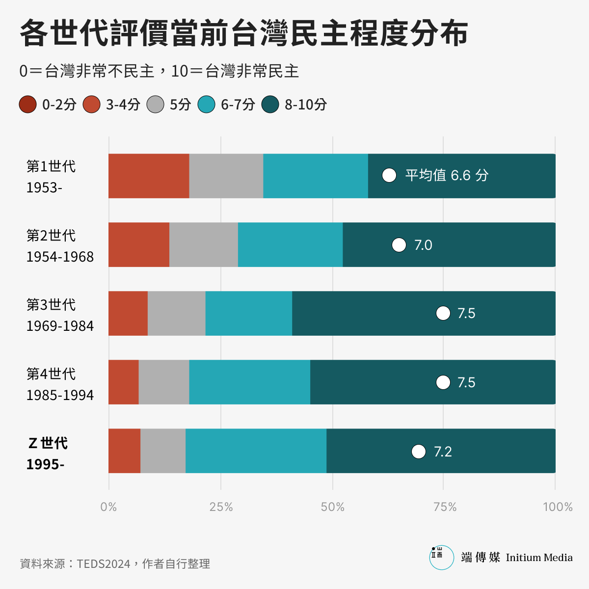 換言之,台灣民眾普遍認為目前民主程度偏高。各世代由遠至近給予6以上的比例分別為65.2%、71.1%、78.5%、81.8%、82.7%。顯示愈年輕的世代,認為台灣目前屬於民主的比例愈高。