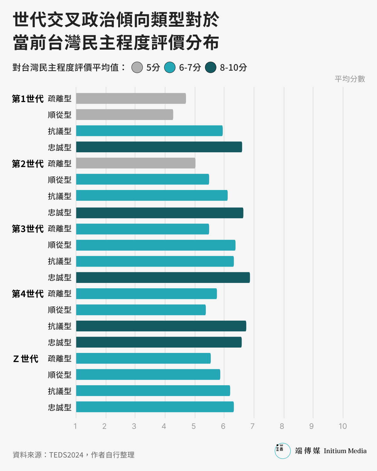 對於民主程度評價,往往與民主滿意度相關。將世代交叉政治傾向類型之後,觀察對於民主滿意者的比例分布也可發現,結果和民主程度評價基本一致。這顯示,高政治效能感,與對於民主的正面評價息息相關。民主化(第3世代)以後世代的忠誠型民眾,都有9成以上對台灣民主現況感到滿意,Z世代的忠誠型滿意比例更高達97.0%。
