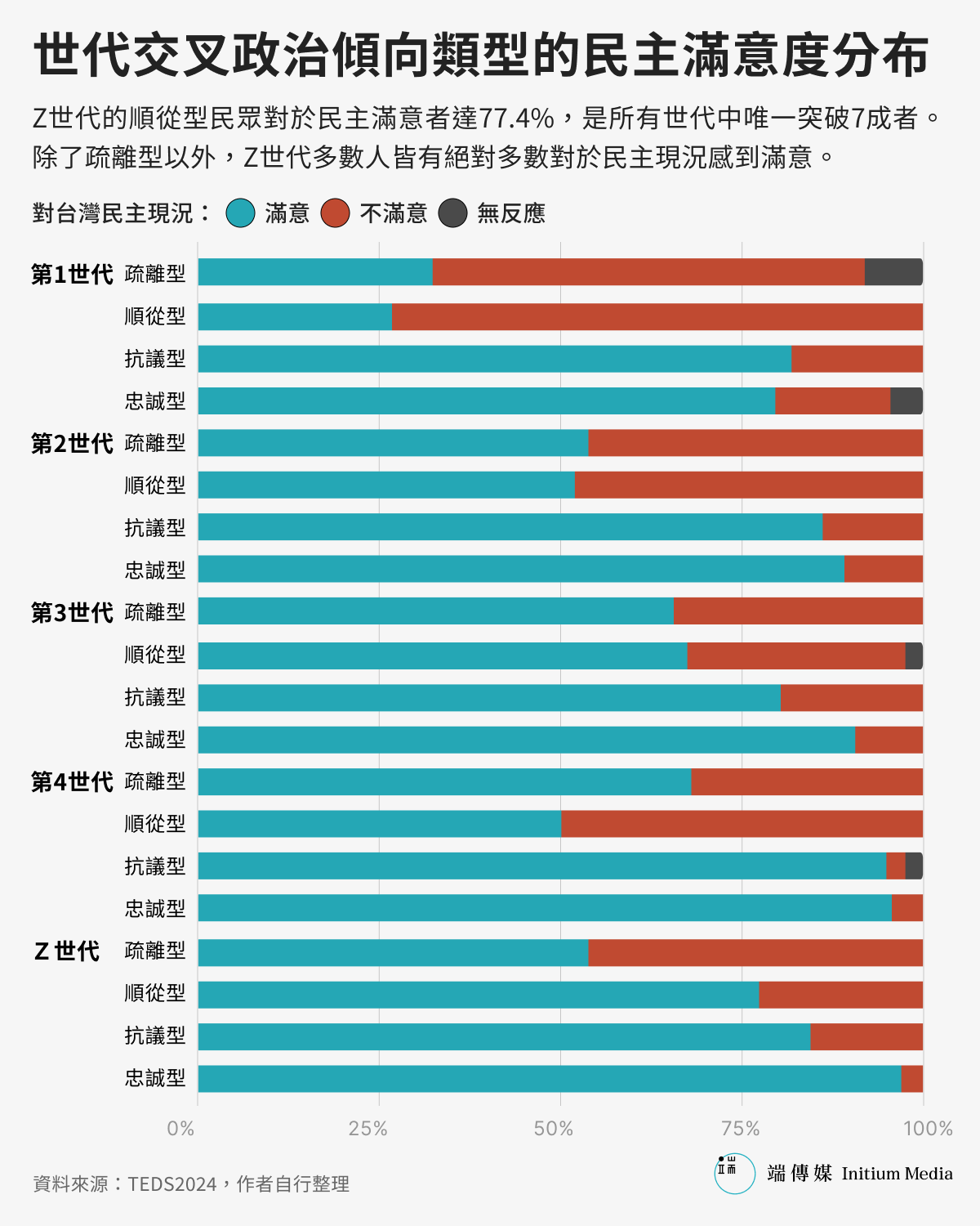 此外,Z世代的順從型民眾(低效能感-高信任)對於民主滿意者也達77.4%,是所有世代中唯一突破七成者。這顯示,除了疏離型民眾以外,Z世代的多數人不論何種政治傾向類型,皆有絕對多數對於民主現況感到滿意。
