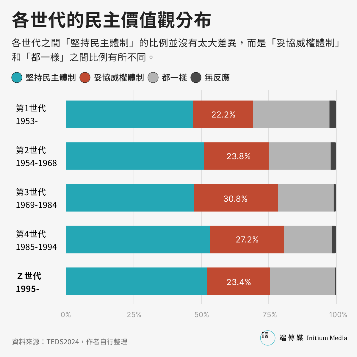 而Z世代有過半堅持民主體制,屬於「妥協威權體制」的比例(23.4%),相較於民主化的第3世代(30.8%)、接受認識台灣教材的第4世代(27.2%)也更低。按照時間推算,1987年蔣經國過世時,第3世代最年長者不過18歲。本文推測,是否可能因為第3、4世代成長階段正好經歷蔣經國執政後期,也聽過更多「蔣經國傳說」,使得更多人對於威權體制有美好想像所致。