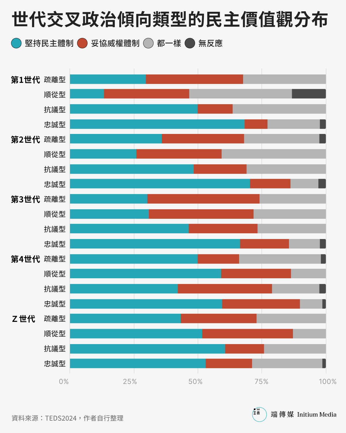 經過整理後,各世代的政治傾向類型分布如下。可以觀察到,政治效能感與政治信任存在正相關。屬於高政治效能感者(抗議型與忠誠型),高政治信任的比例較多,因此忠誠型多於抗議型。而屬於低政治效能感者(疏離型與順從型),低政治信任比例較多,因此疏離型多於順從型。
