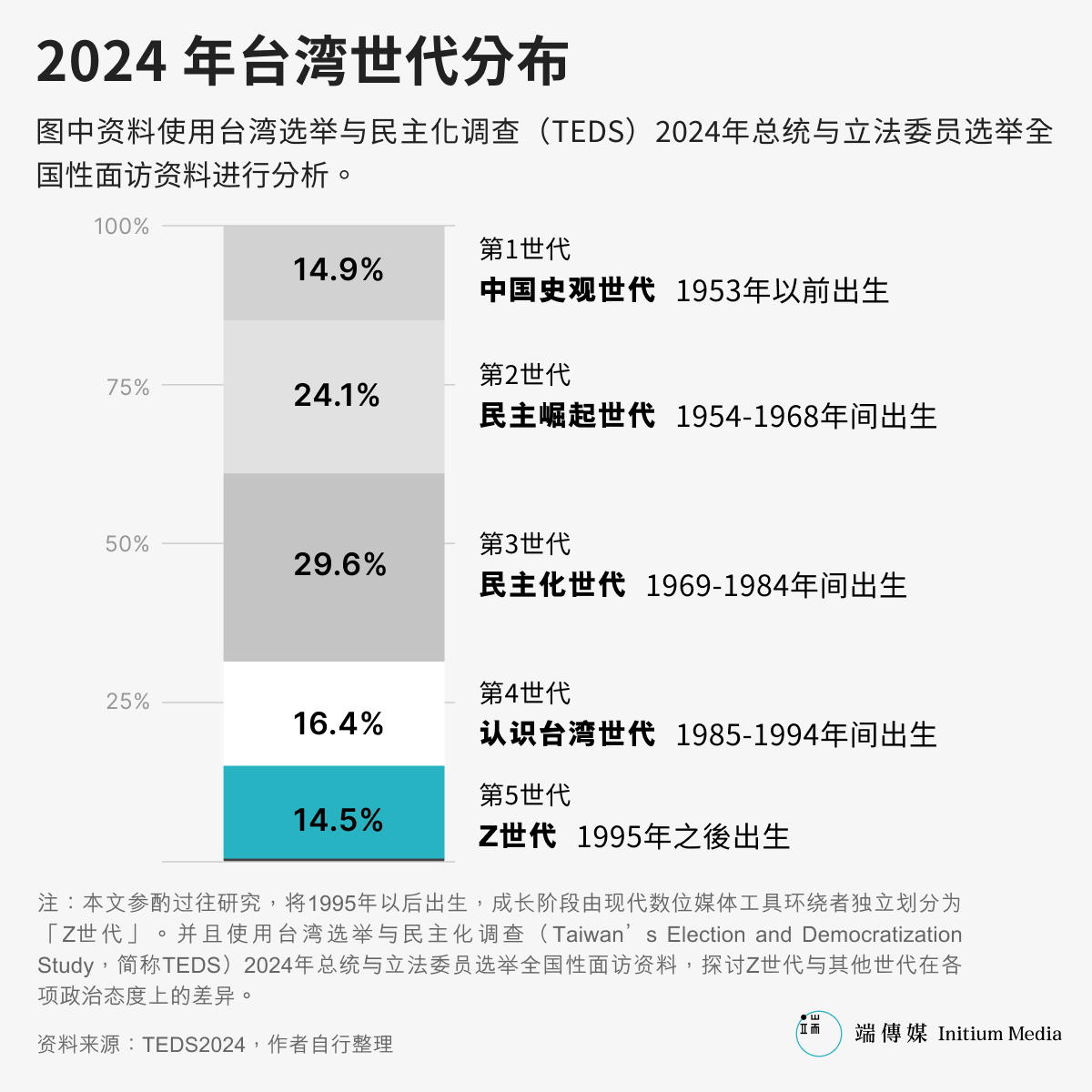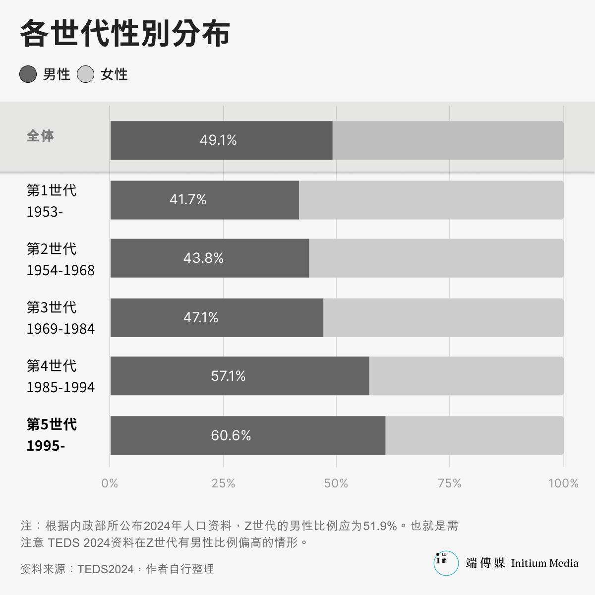 在人口特征分布上,TEDS2024的Z世代男性比例明显偏高,达60.6%,与第4世代(57.1%)相仿,较全体男性比例49.1%高出11.5%。然而根据内政部所公布2024年人口资料,Z世代的男性比例应为51.9%。也就是说,TEDS2024资料在Z世代有男性比例偏高的情形,需要注意。