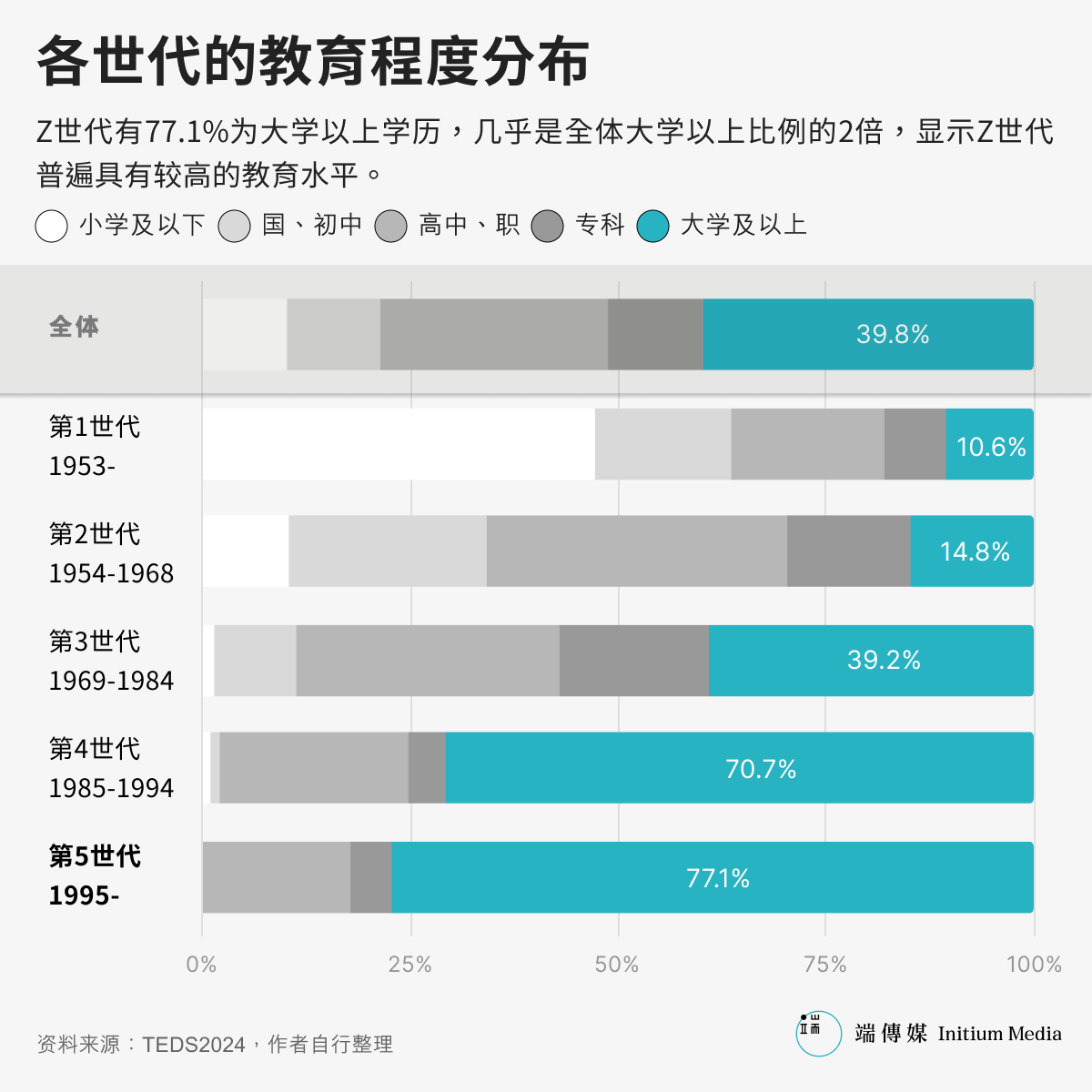 在教育程度方面,Z世代有77.1%为大学以上学历,几乎是全体大学以上比例39.8%的2倍,显示Z世代普遍具有较高的教育水平。而这个现象与第4世代亦相仿,第4世代大学以上学历者也已经超过70%。