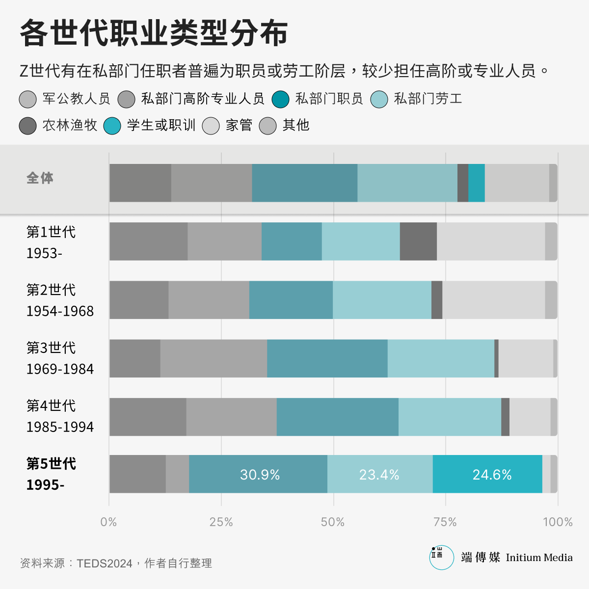 在粗略的职业类型方面,Z世代有在私部门任职者普遍为职员(30.9%)或劳工(23.4%)阶层,较少担任高阶或专业人员。此外,Z世代仍有24.6%为学生或参加职业训练中。