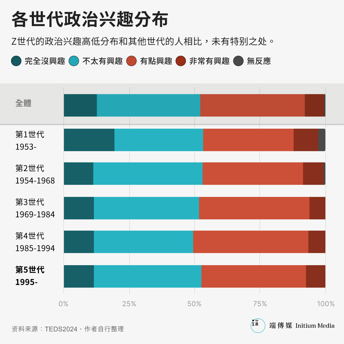 换言之,我们无法宣称Z世代的人对于政治议题偏冷漠,因为他们的政治兴趣高低分布,和其他世代的人相比,并未有特别之处。
