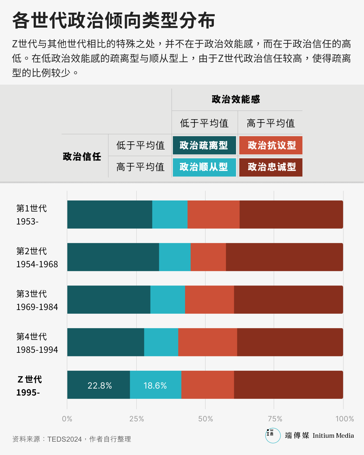然而,Z世代的疏离型比例(22.8%)比其他世代更低,这代表Z世代“低效能-低信任”的人最少。与此同时,顺从型的比例(18.6%)却比其他世代来得高,显示Z世代“低效能-高信任”的人也有相当比例。单独将疏离型与顺从型进行检定,结果也显示Z世代和第1、4世代在95%信心水准下未有显著差异,而和第2、3世代都有显著差异(注5)。
