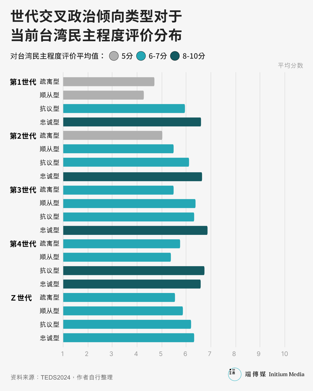 对于民主程度评价,往往与民主满意度相关。将世代交叉政治倾向类型之后,观察对于民主满意者的比例分布也可发现,结果和民主程度评价基本一致。这显示,高政治效能感,与对于民主的正面评价息息相关。民主化(第3世代)以后世代的忠诚型民众,都有9成以上对台湾民主现况感到满意,Z世代的忠诚型满意比例更高达97.0%。