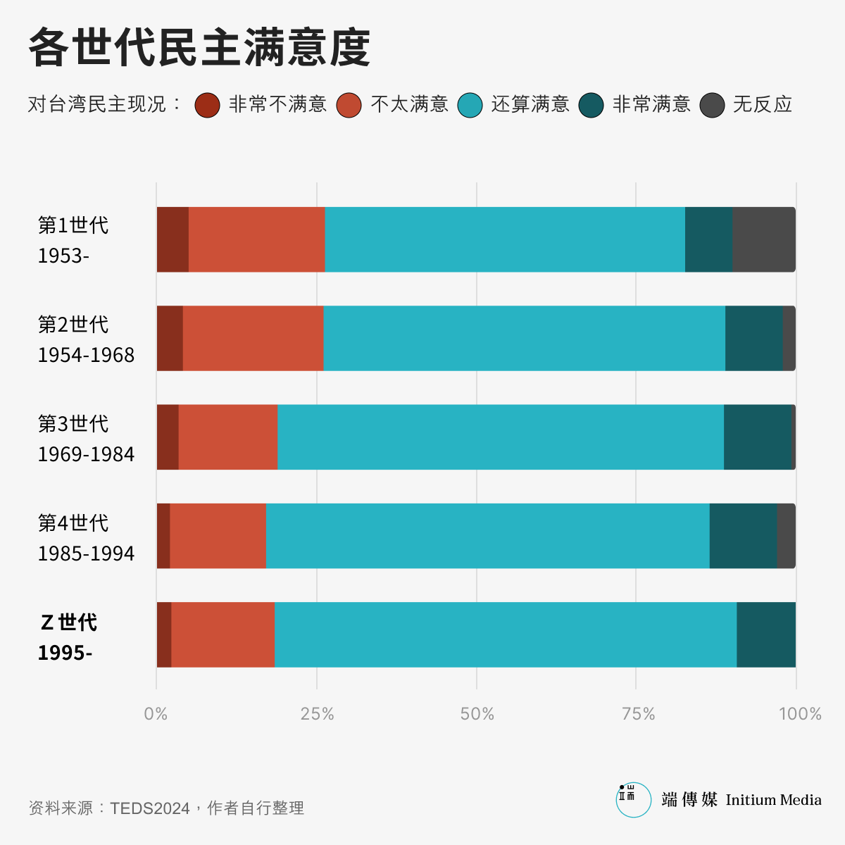 那么,各世代对于民主程度的评价普遍偏高,但对于民主的现况是否满意呢?TEDS2024也询问受访者“整体来说,请问您对台湾民主政治实行的情况,是非常满意、还算满意、不太满意、还是非常不满意?”。结果显示,整体而言各世代皆有六成以上对于台湾民主感到满意(含还算满意与非常满意),且Z世代的民主满意度甚至高达81.6%,是所有世代最高者。