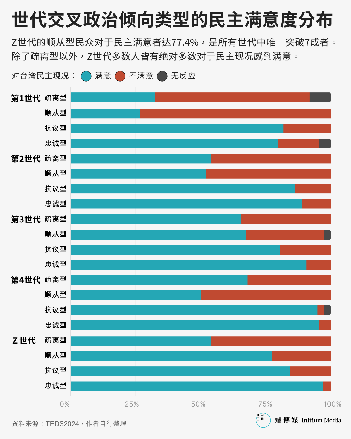 此外,Z世代的顺从型民众(低效能感-高信任)对于民主满意者也达77.4%,是所有世代中唯一突破七成者。这显示,除了疏离型民众以外,Z世代的多数人不论何种政治倾向类型,皆有绝对多数对于民主现况感到满意。