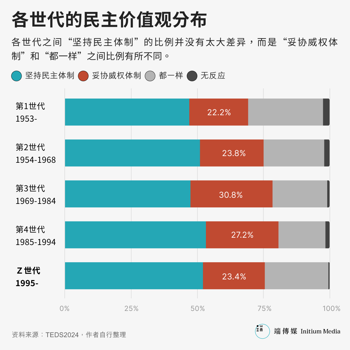 而Z世代有过半坚持民主体制,属于“妥协威权体制”的比例(23.4%),相较于民主化的第3世代(30.8%)、接受认识台湾教材的第4世代(27.2%)也更低。按照时间推算,1987年蒋经国过世时,第3世代最年长者不过18岁。本文推测,是否可能因为第3、4世代成长阶段正好经历蒋经国执政后期,也听过更多“蒋经国传说”,使得更多人对于威权体制有美好想像所致。