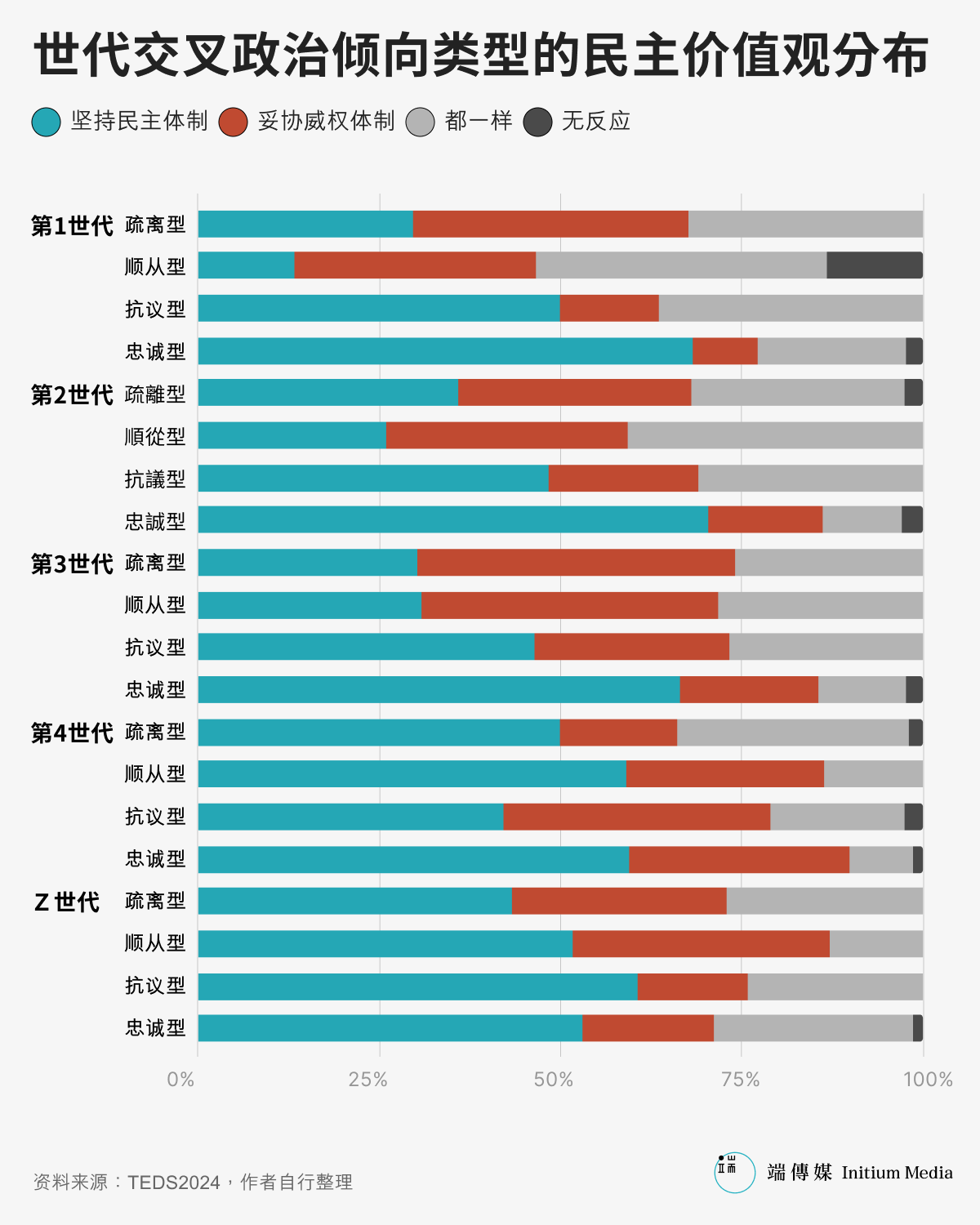 经过整理后,各世代的政治倾向类型分布如下。可以观察到,政治效能感与政治信任存在正相关。属于高政治效能感者(抗议型与忠诚型),高政治信任的比例较多,因此忠诚型多于抗议型。而属于低政治效能感者(疏离型与顺从型),低政治信任比例较多,因此疏离型多于顺从型。
