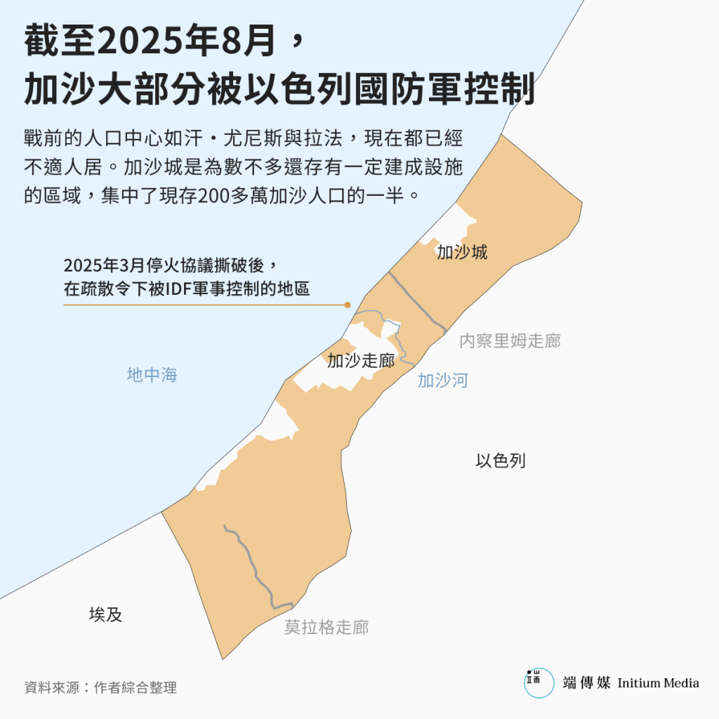 目前,加沙地區全部的基礎設施與居住區都幾乎遭受災難性損害,戰前的人口中心如汗·尤尼斯與拉法,現在都已經不適人居。加沙城是為數不多還存有一定建成設施的區域,集中了現存200萬加沙人口中的一半人。以色列國防軍則從8月底開始於城市外圍進行試探性進攻,9月初在轟炸和定向爆破的掩護下,正在向城市中心推進。以色列官方於9月9日向加沙居民發出最新警告,要求他們立刻、全面撤出加沙城。這意味着以軍的攻勢已進入加速階段。