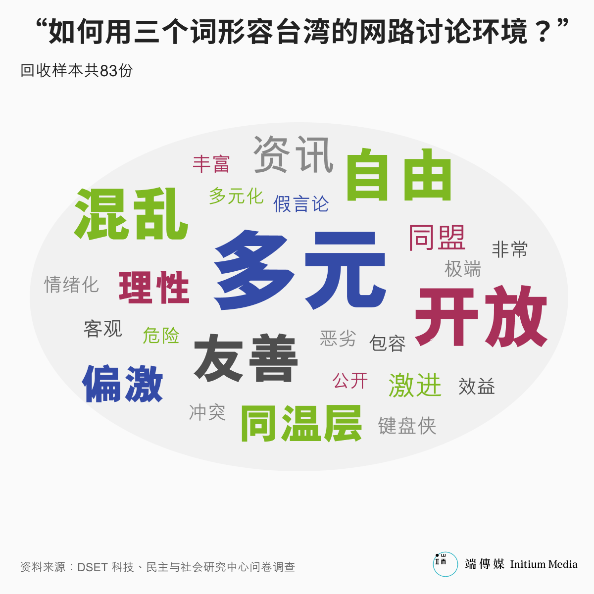 当受访者被问到“如何用三个词形容台湾的网路讨论环境?”时,回收的问卷中最常出现的答案是“多元”(17次)、“开放”(10次),紧接著是“自由”(8次)与“混乱”(8次)。而当我们在访谈中深入追问,几乎所有人都会先反问:“你是说在哪个平台上?”这意味著,在他们心中,并不存在一个单一的“网路”,而是一个由不同氛围、不同规则的平台所组成的生态系。