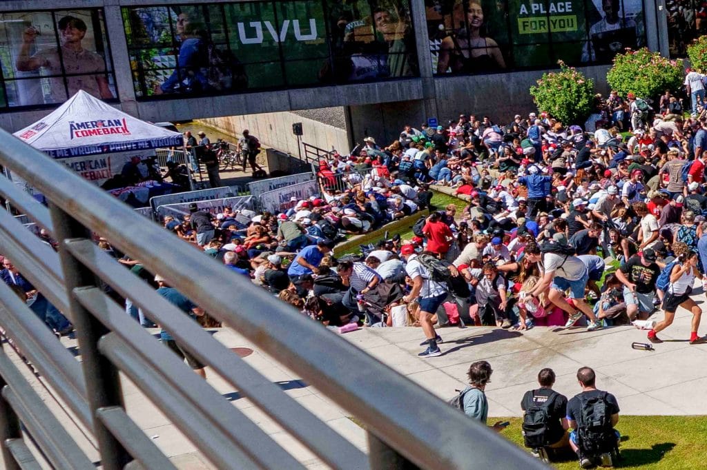 現場目擊者稱,Kirk當時正在戶外進行名為「證明我錯了」(Prove Me Wrong)的互動問答環節,突然從約200碼外的校園建築物傳來槍響,Kirk頸部中彈,大量流血後倒地。社交媒體流傳的現場視頻顯示,槍響後Kirk用手捂住頸部,隨即癱軟倒下,現場學生驚慌逃散。
