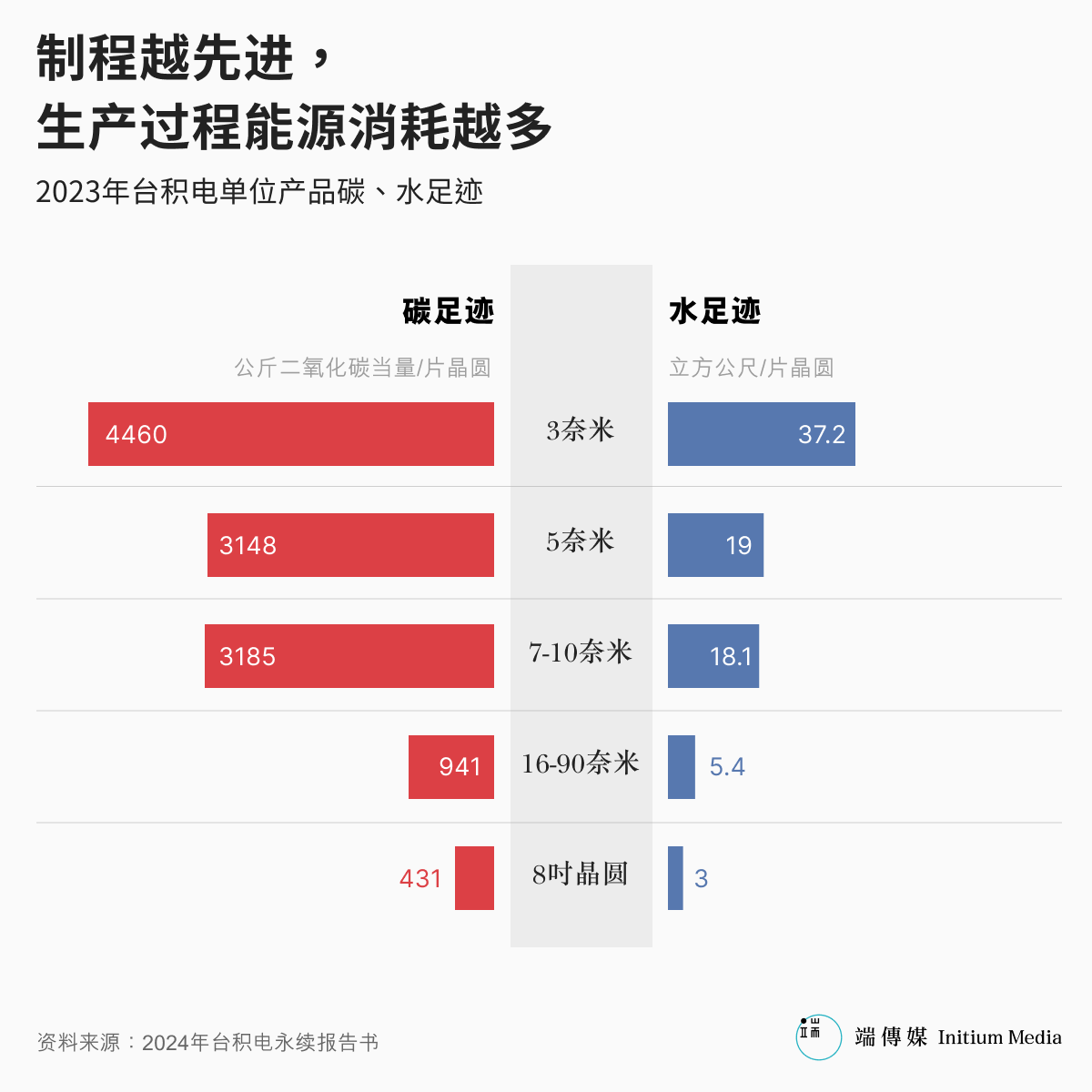 2023年,台积电每制造一片3奈米晶圆,会产生相当于4460公斤二氧化碳的碳排量,消耗37.2立方公尺的水。和上一世代的5奈米晶圆相比,碳足迹增加四成,水足迹增加近一倍。和主要用于90奈米以上成熟制程的8吋晶圆相比,碳足迹超过10倍,水足迹超过12倍。