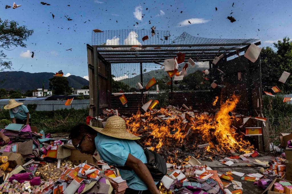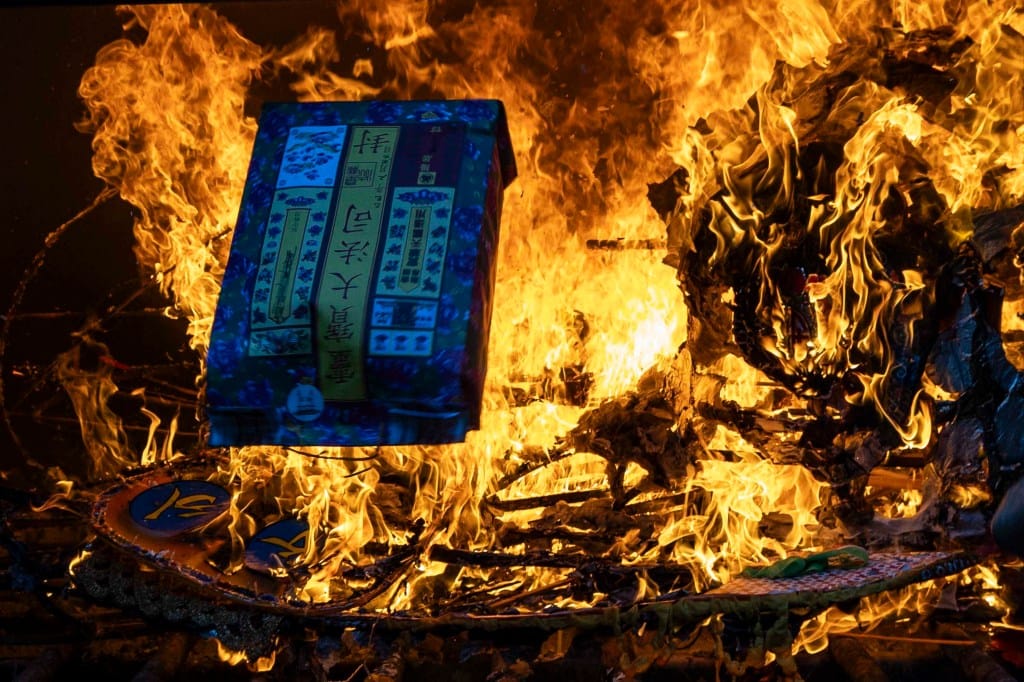 2025年9月3日,元朗大江埔盂兰胜会,群众在火炉化宝烧衣。摄:邓家烜/端传媒