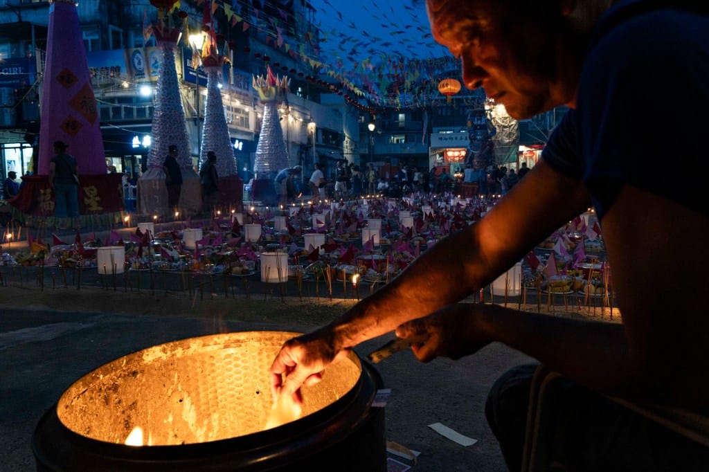 2025年9月6日,坪洲中元建醮盂兰胜会,居民守在天席前的火盘化纸钱。摄:邓家烜/端传媒