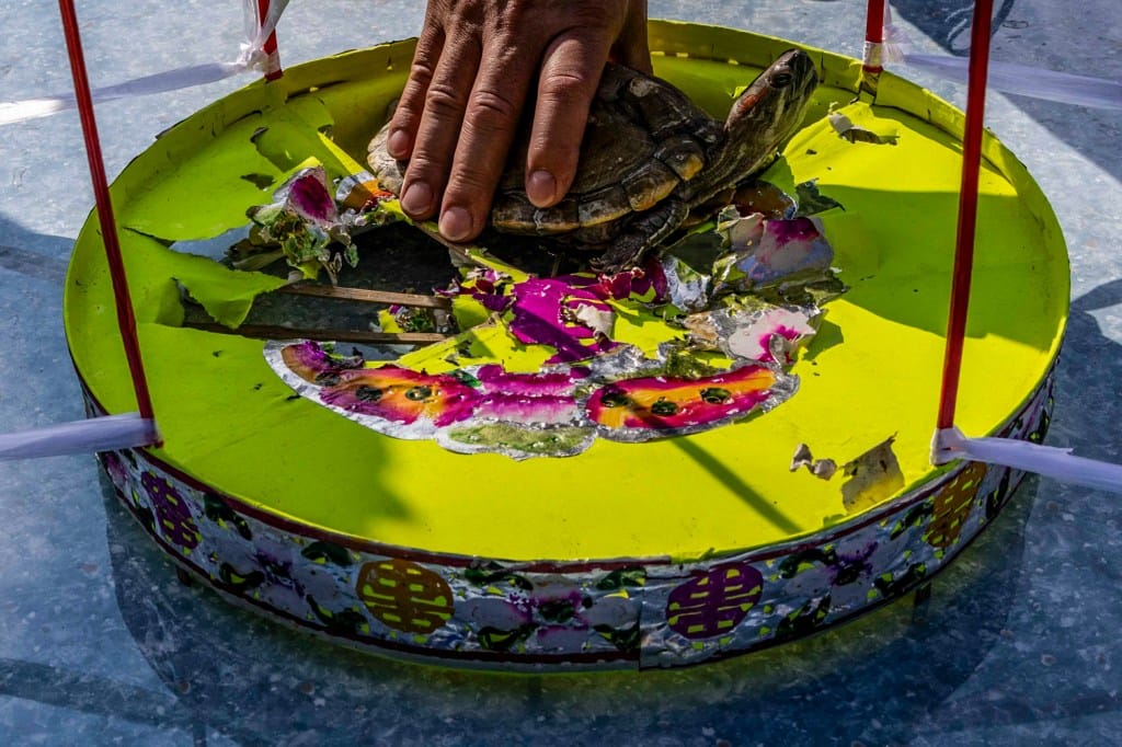 2025年9月6日,坪洲中元建醮盂兰胜会,居民到沙滩准备将乌龟放回大海。摄:邓家烜/端传媒