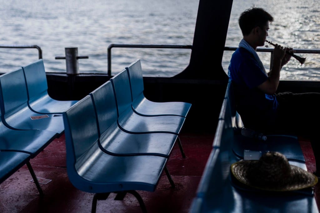 2025年9月6日,坪洲,相传水鬼无法登岸取食,居民乘船出海吹唢呐召水鬼。摄:邓家烜/端传媒