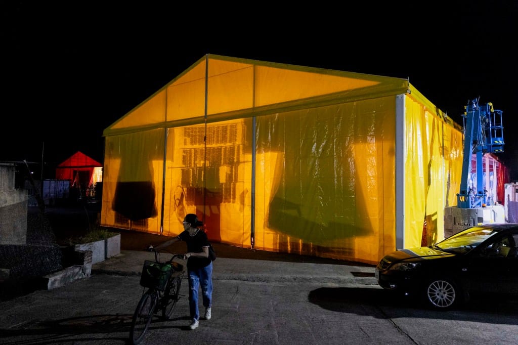 2025年9月2日,元朗大江埔盂兰胜会,神功戏演员在戏棚前化妆。摄:邓家烜/端传媒