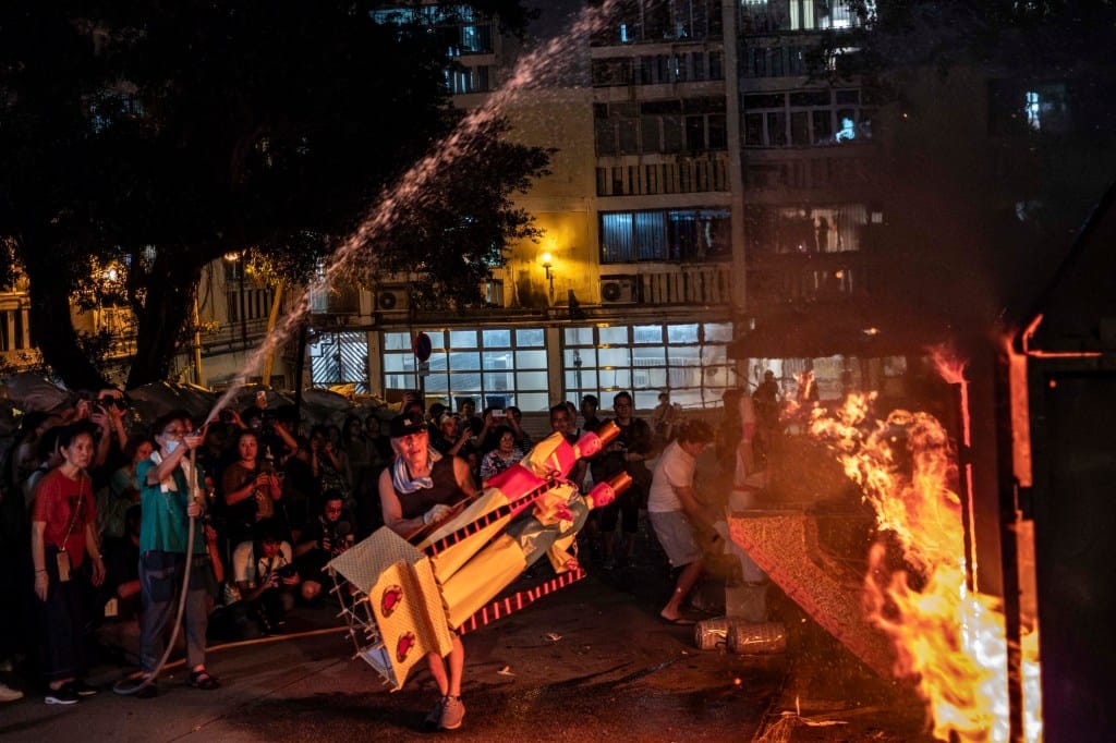 2025年8月31日,华富邨复办盂兰胜会 ,仪式结束前把纸扎公仔带往化宝炉焚烧,寓意在地府服侍先人。摄:邓家烜/端传媒