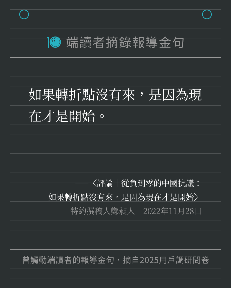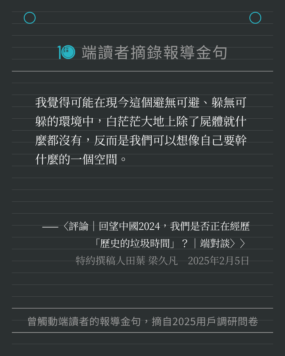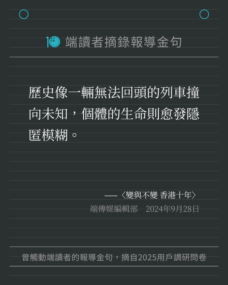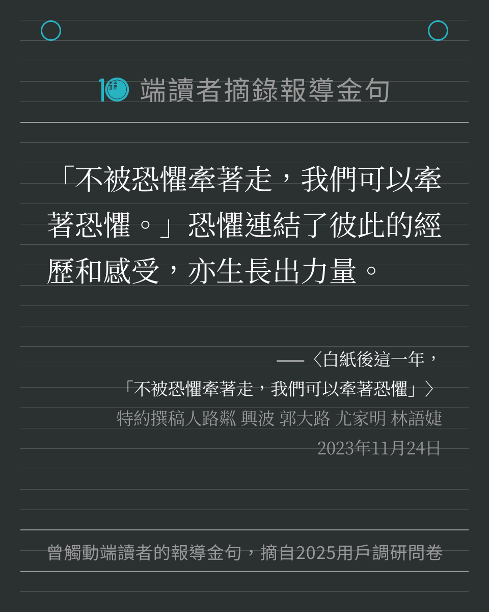 端傳媒在 2025 年度用戶調研問卷中,向讀者徵集「還記得端的哪一篇報導、哪一句話,讓你印象深刻嗎?」我們收到許多回饋,閱讀這些文字時,也重新被喚醒記憶,好像再一次置身那些新聞時刻。