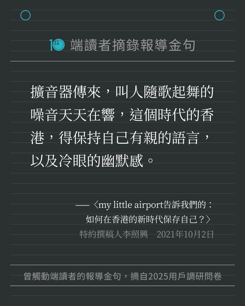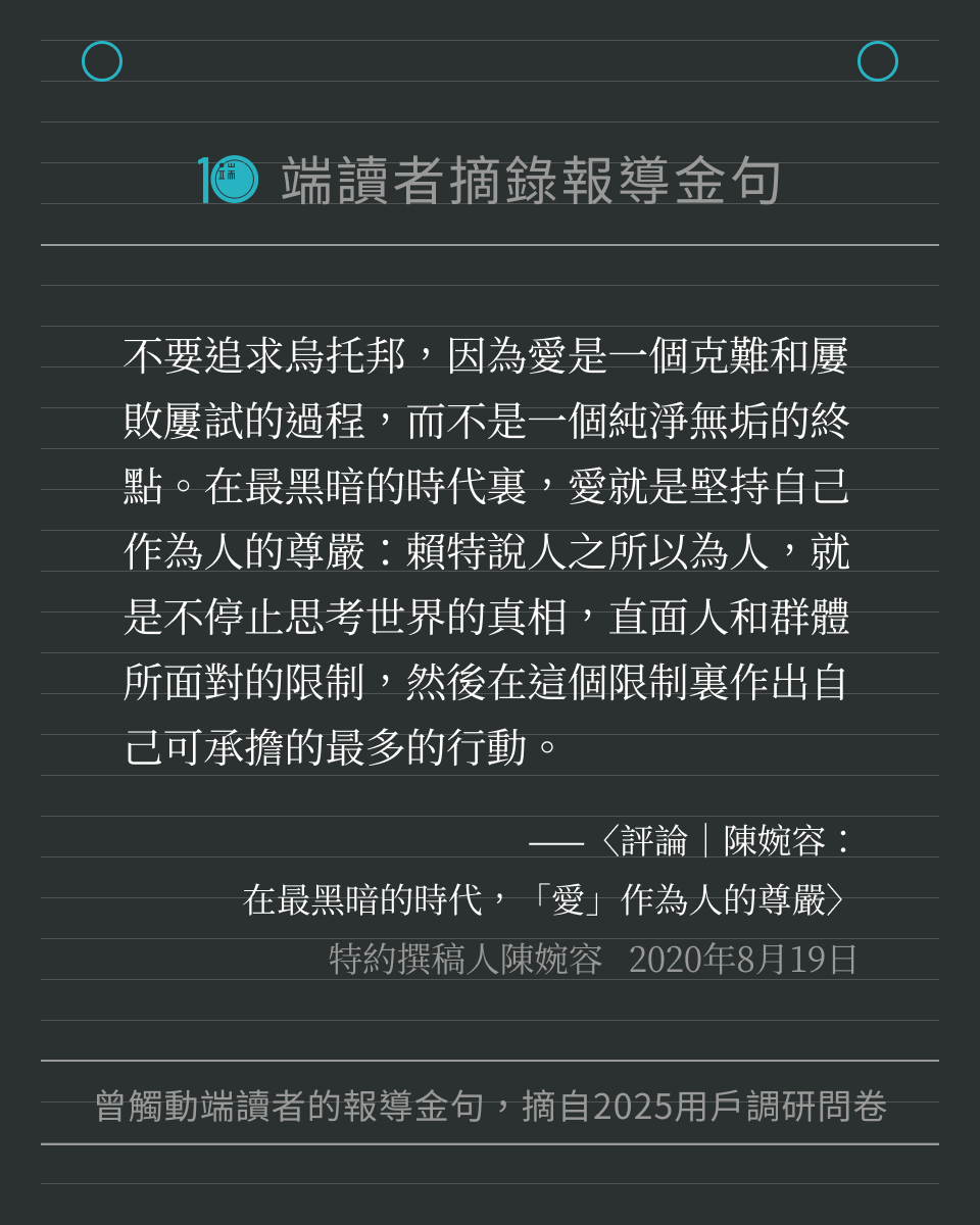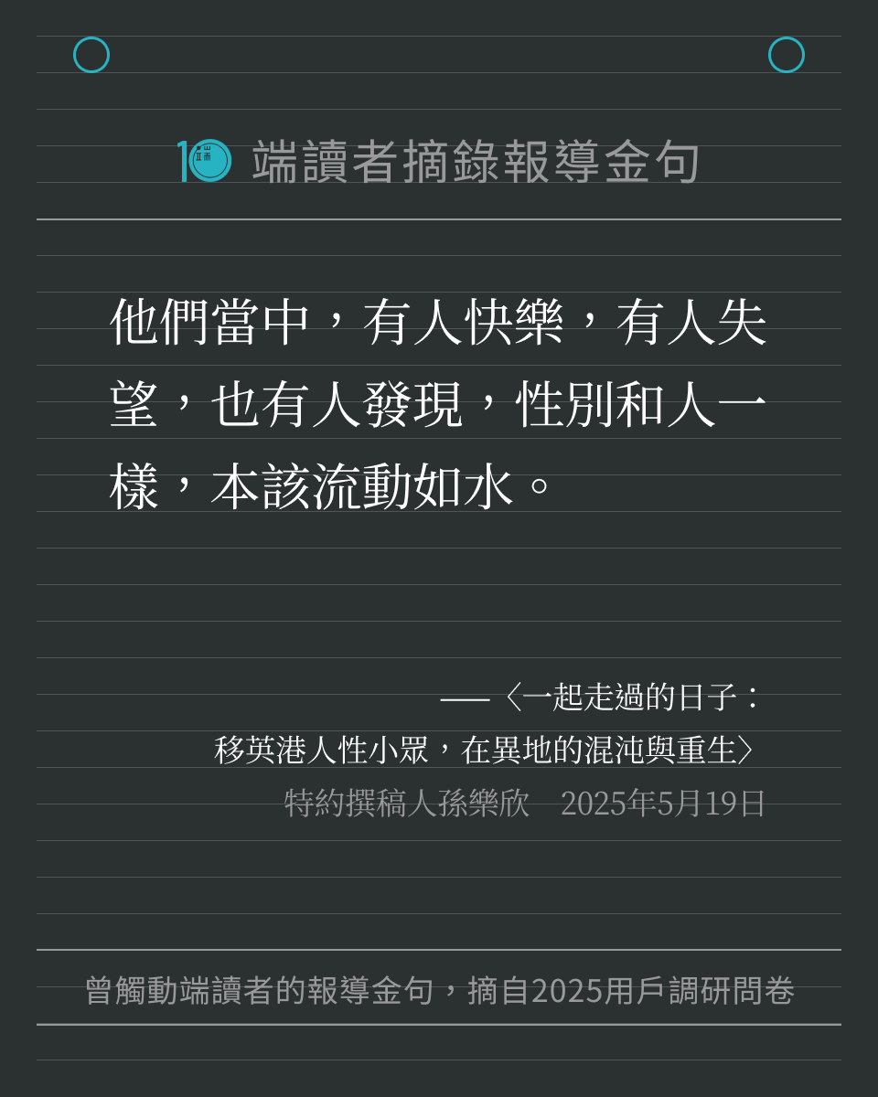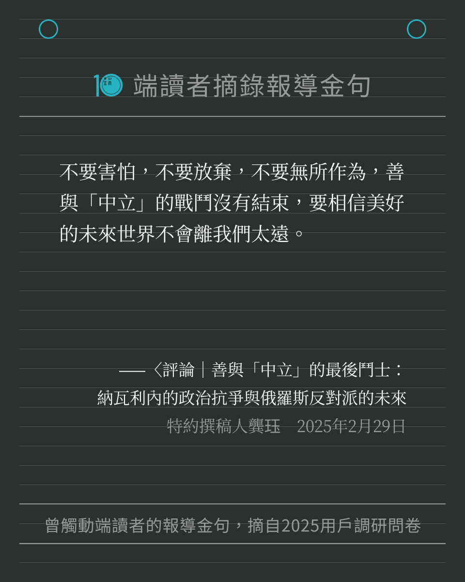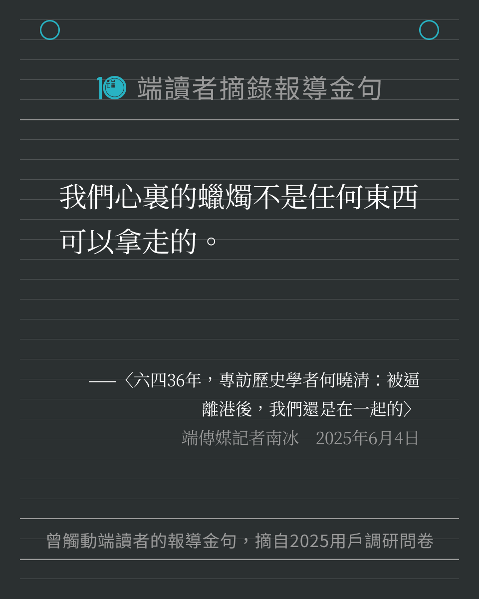端傳媒在 2025 年度用戶調研問卷中,向讀者徵集「還記得端的哪一篇報導、哪一句話,讓你印象深刻嗎?」我們收到許多回饋,閱讀這些文字時,也重新被喚醒記憶,好像再一次置身那些新聞時刻。