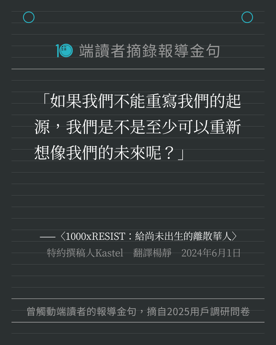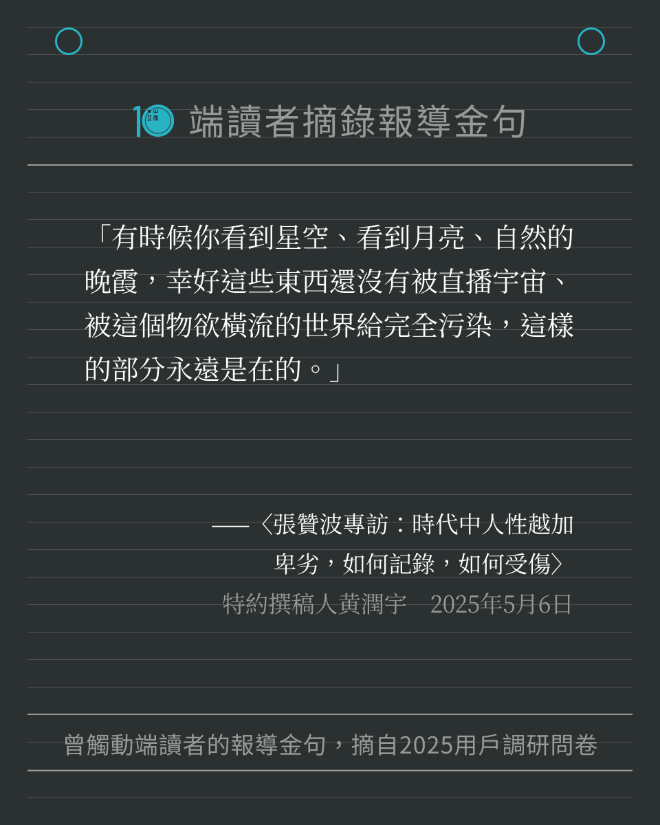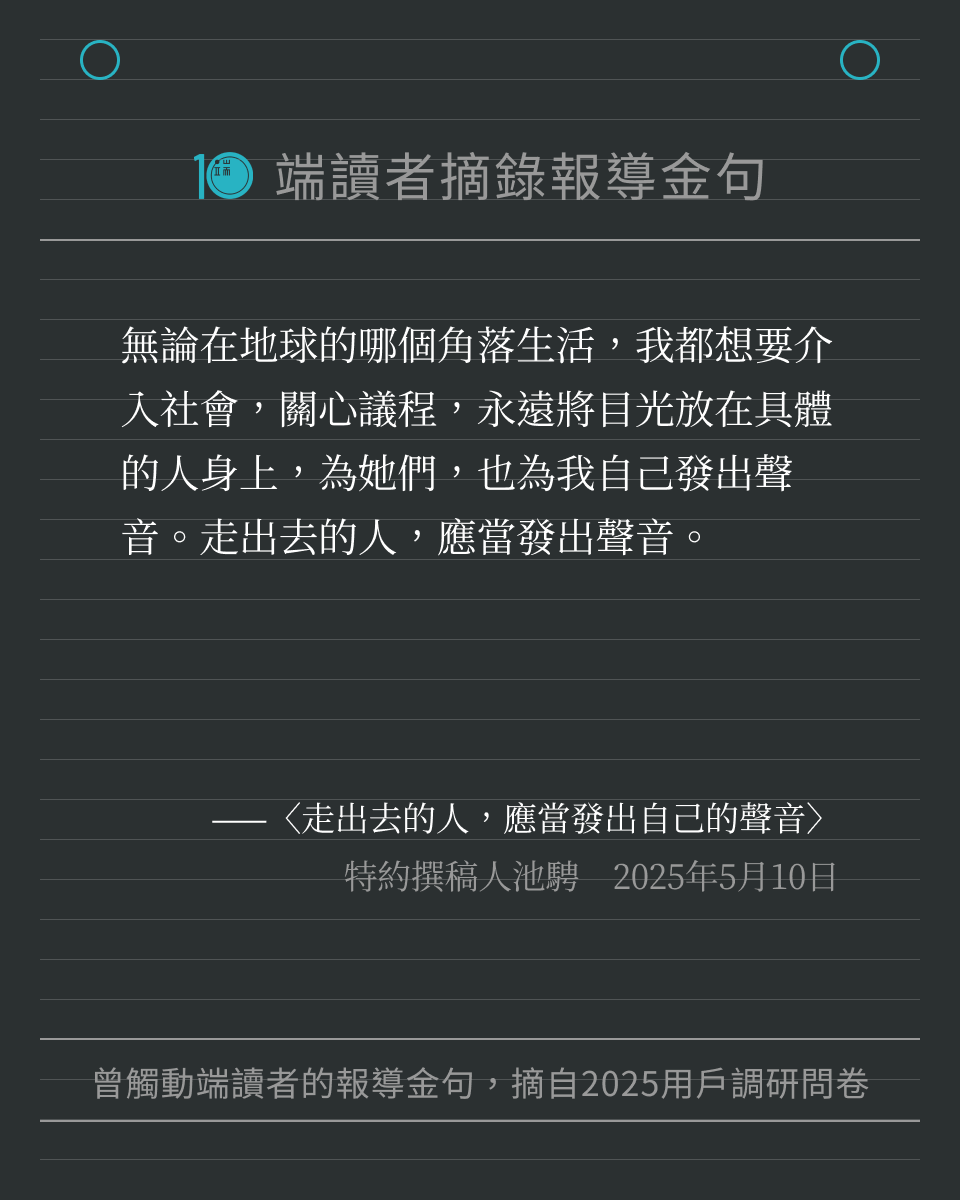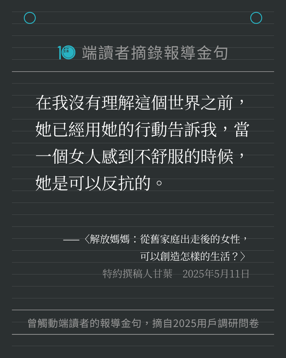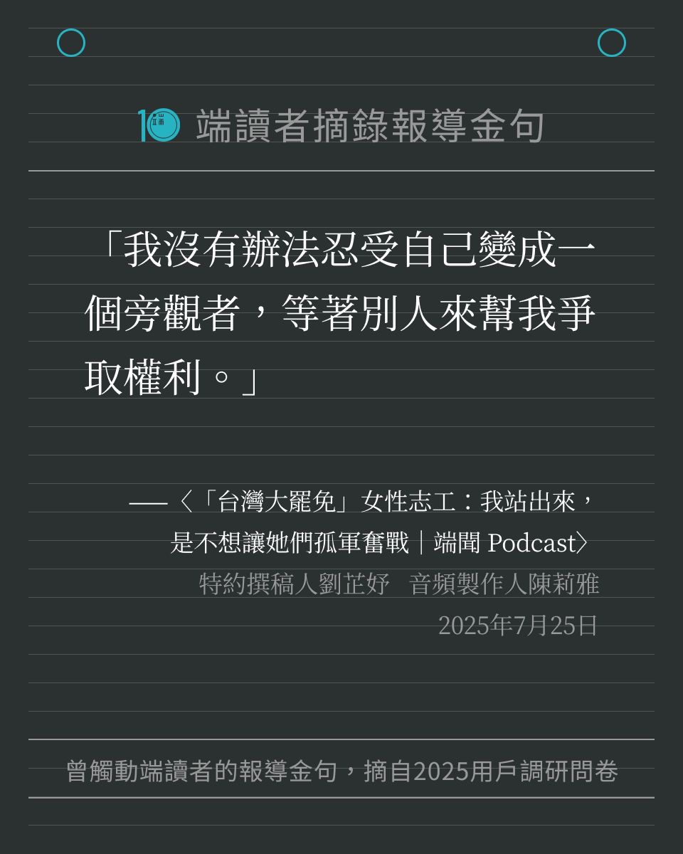 每一位讀者的留言,都提醒著我們繼續記錄世界。我們將這些字句製作成圖卡,歡迎儲存圖卡、重新細讀報導,也歡迎分享給身邊親友。希望這些文字,可以像最初讀到報導時那樣,帶來力量與思考。