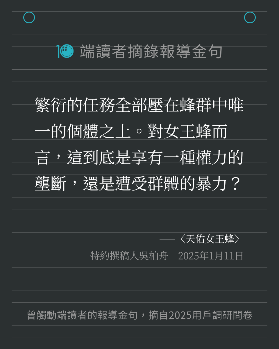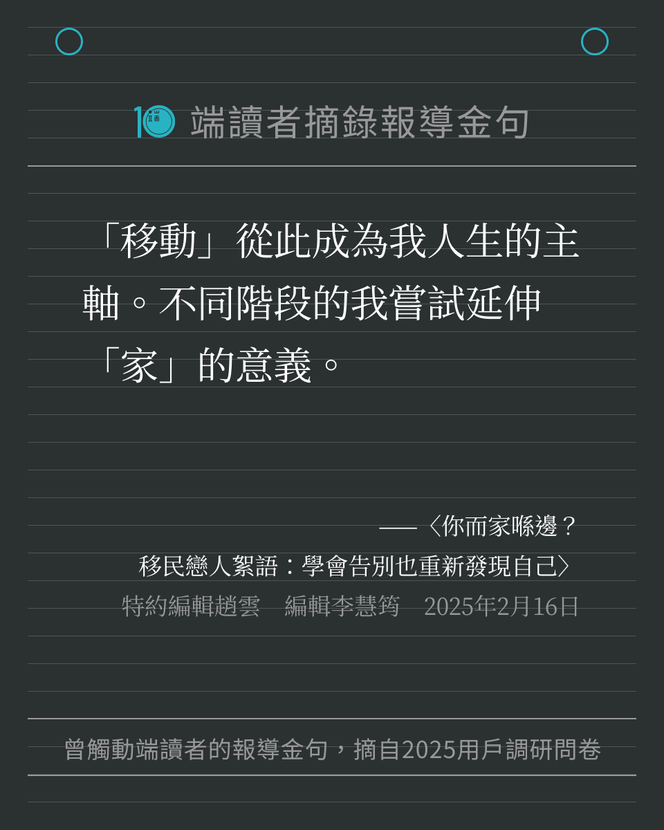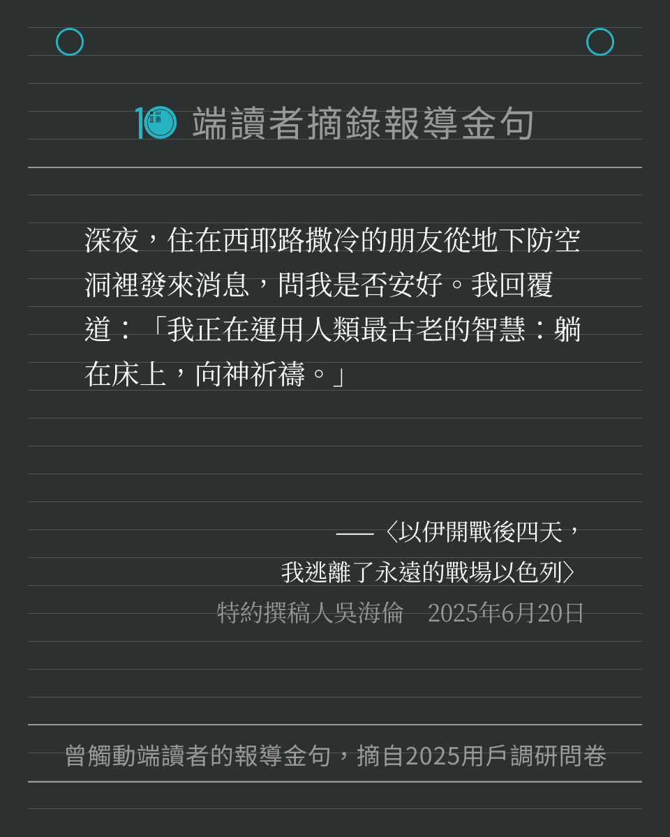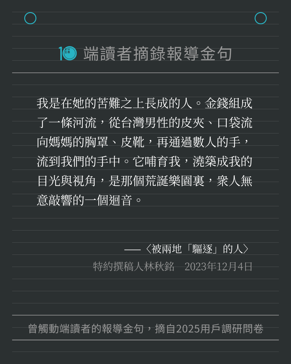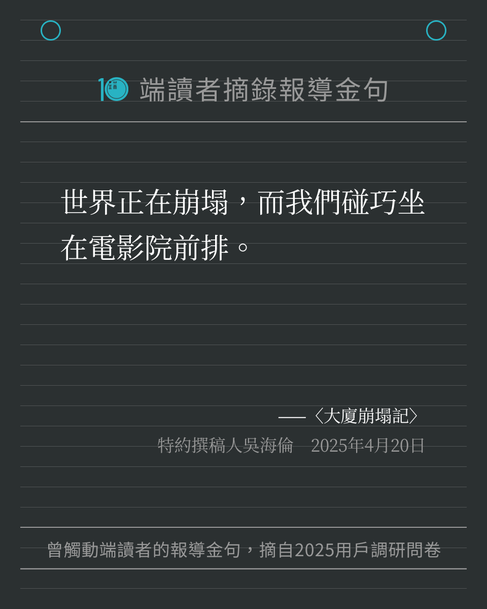 每一位讀者的留言,都提醒著我們繼續記錄世界。我們將這些字句製作成圖卡,歡迎儲存圖卡、重新細讀報導,也歡迎分享給身邊親友。希望這些文字,可以像最初讀到報導時那樣,帶來力量與思考。
