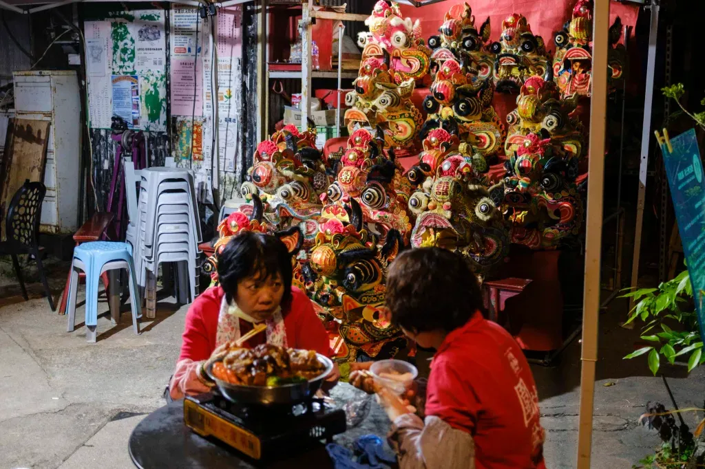 天后誕當日,16隻麒麟獅頭身披五彩鱗甲,被安放在福德祠旁。那是每年均會訂製的麒麟裝扮,一直由茶果嶺麒麟隊保存。隊長扭計叔大汗淋漓,他剛帶隊舞麒麟,小心翼翼把麒麟獅頭放好,他身形瘦削,眼神仍閃鑠着一種精靈。