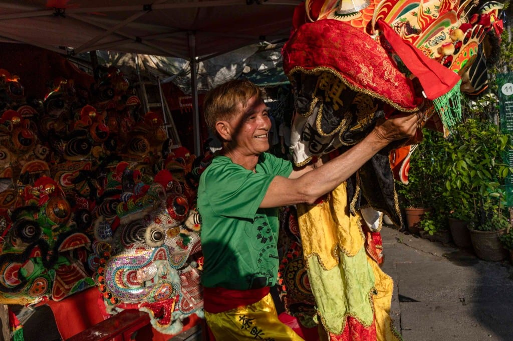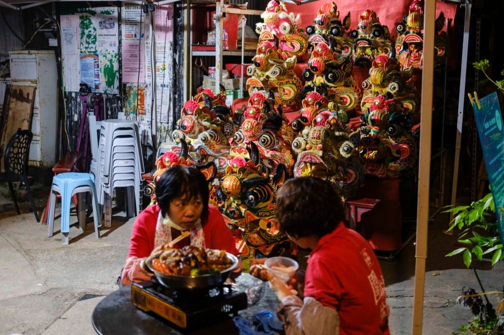 天后诞当日,16只麒麟狮头身披五彩鱗甲,被安放在福德祠旁。那是每年均会订制的麒麟装扮,一直由茶果岭麒麟队保存。队长扭计叔大汗淋漓,他刚带队舞麒麟,小心翼翼把麒麟狮头放好,他身形瘦削,眼神仍闪铄着一种精灵。