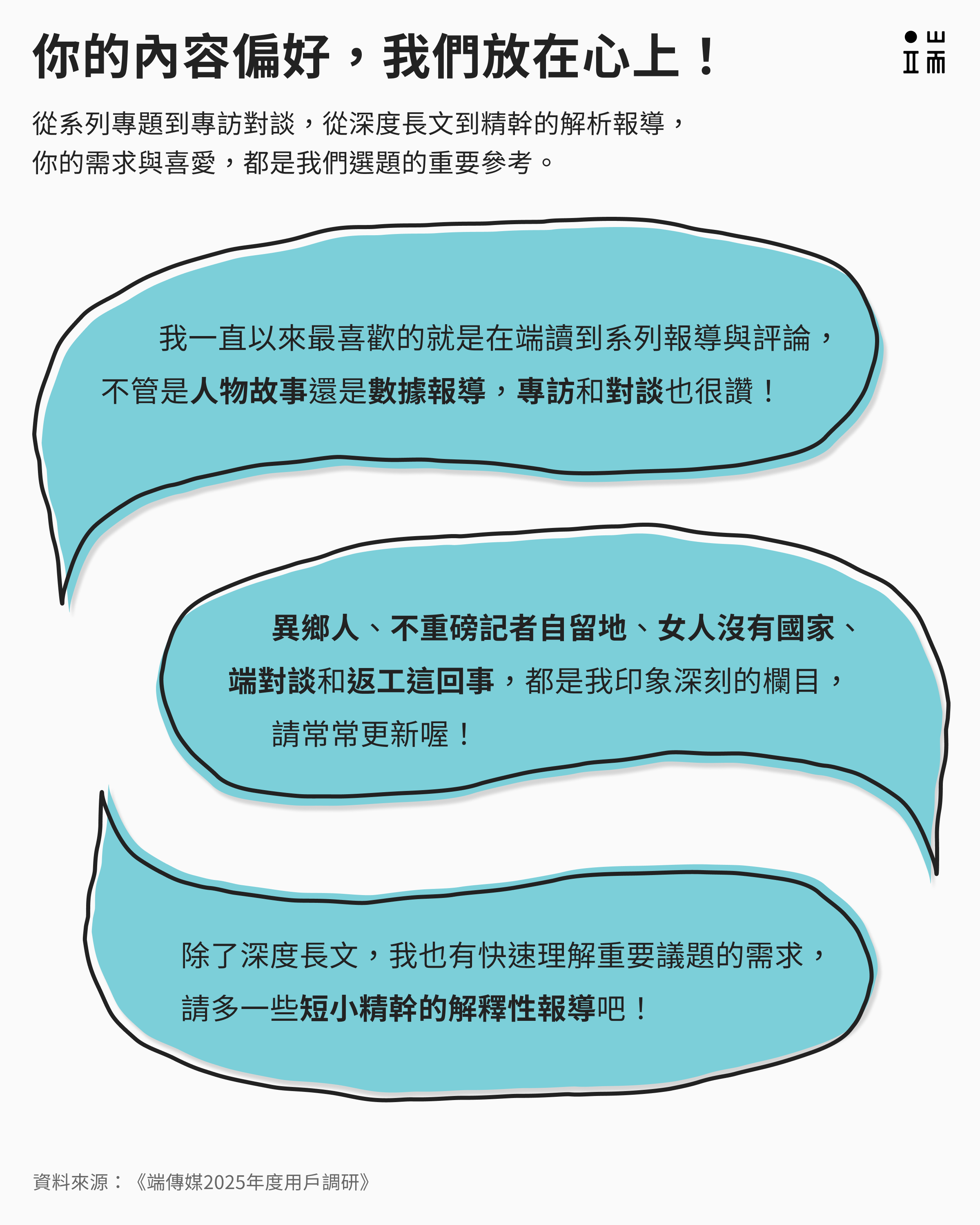 了解了你眼中的端之後,你也告訴了我們,你最愛看的內容、以及希望端能夠提供更多的方向。這些回饋,都是編輯部最在意的提醒。