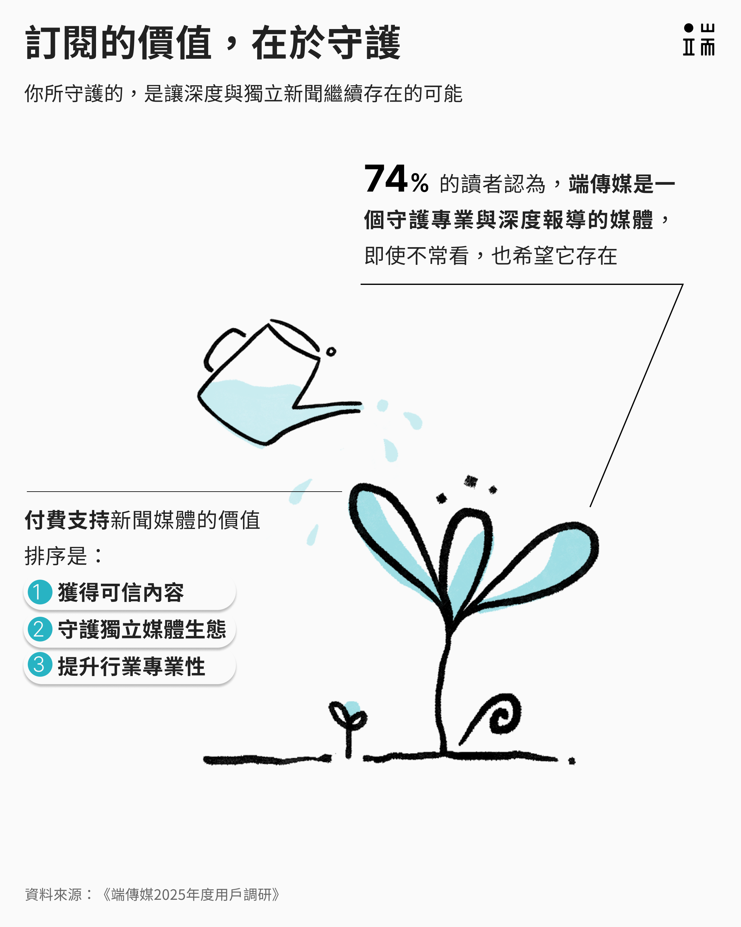 這些年,讀者常會問:訂閱,除了打開付費牆後的深度內容,真的能守護專業報導嗎?小端的回答始終是:可以的!每一份訂閱,都是讓編輯部得以專注報導、持續創作的直接支持。而令小端欣喜的是,今年問卷的數據也印證了這一點。